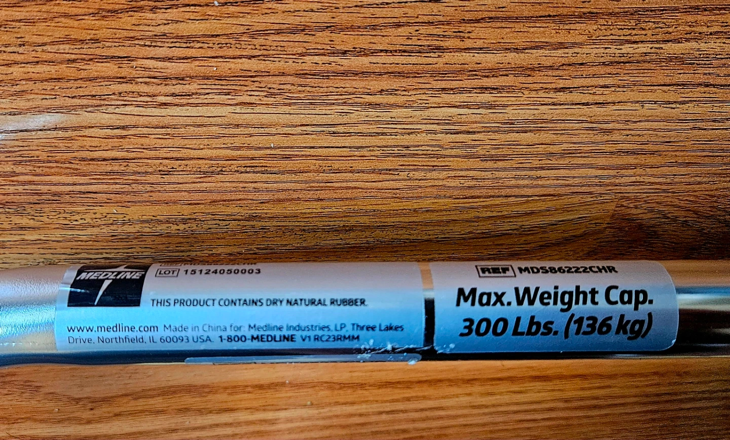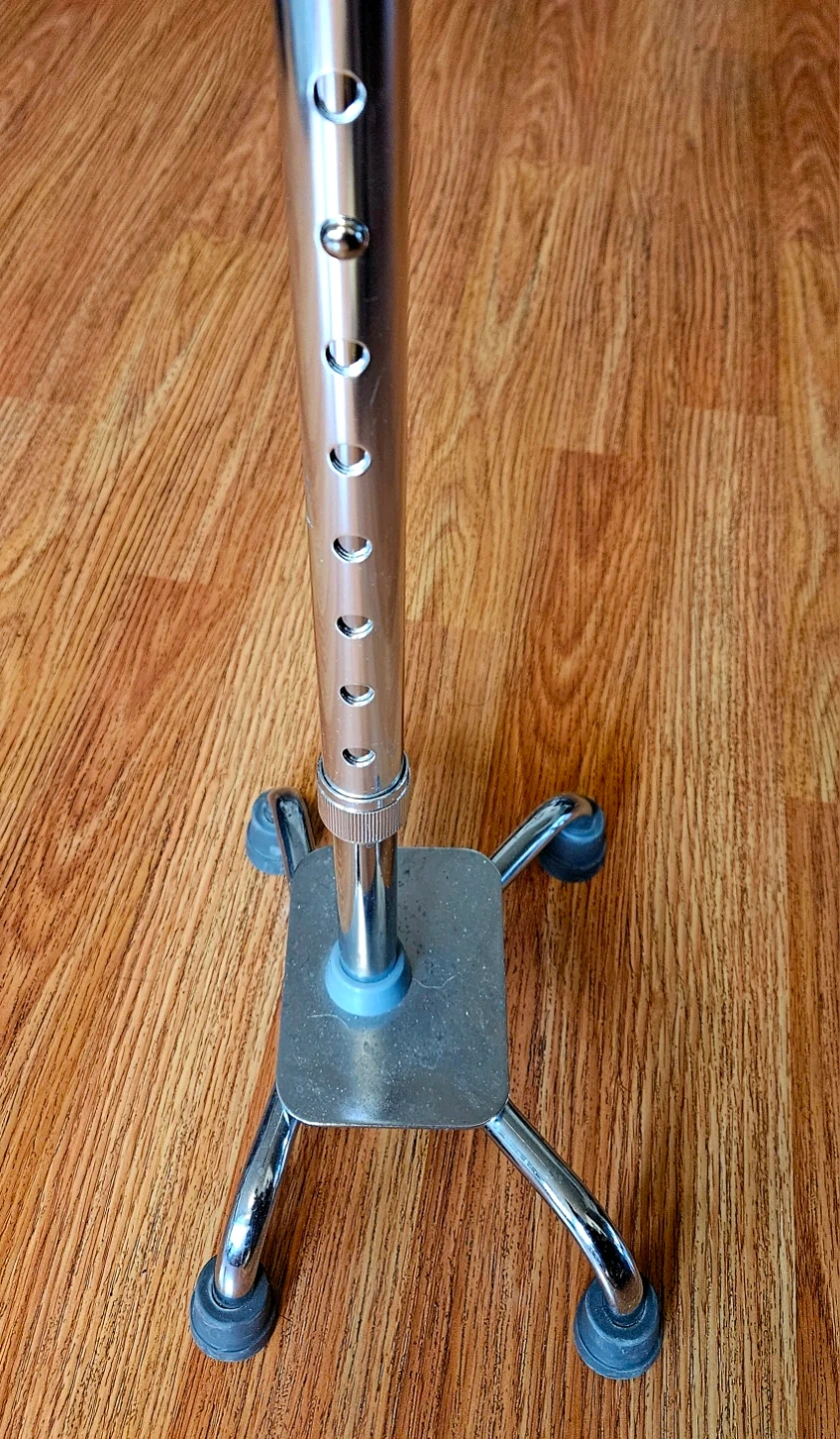 This is a Medline chrome quad with max weight capacity of 300 lbs (136 kg). This cane provides stable support for walking with adjustable height.