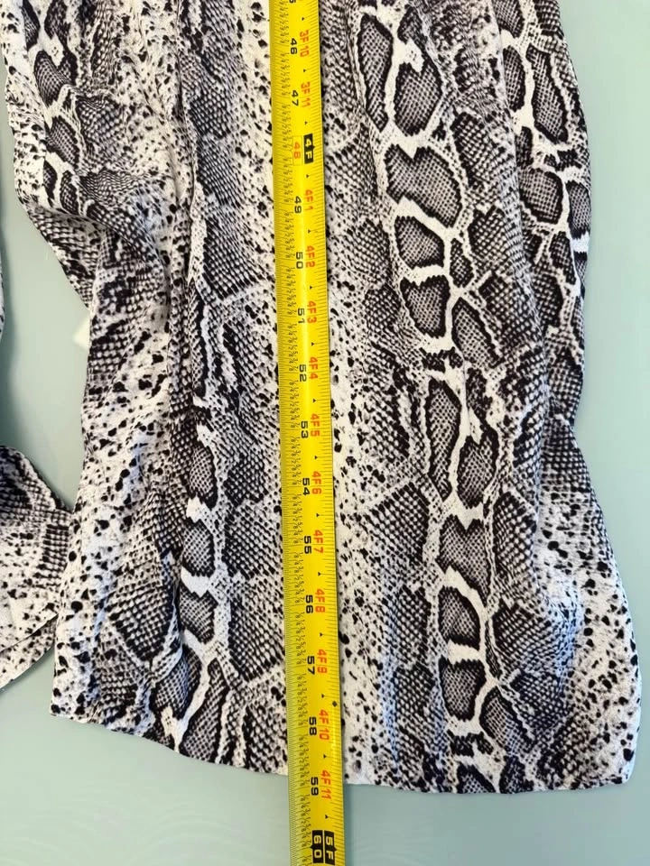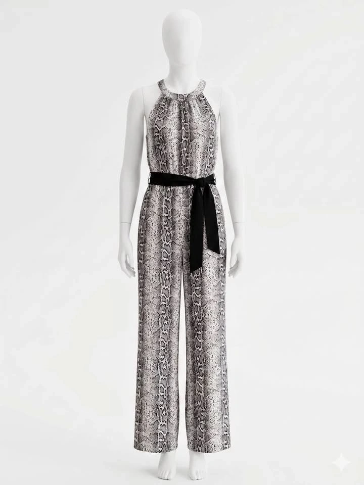 Make a statement in this chic, floor-length jumpsuit featuring a striking grey and white snakeskin print. Designed with a sophisticated high halter neckline and a contrasting black fabric sash to cinch the waist for a flattering silhouette. The wide-leg cut provides a flowy, high-fashion look that is as comfortable as it is stylish.