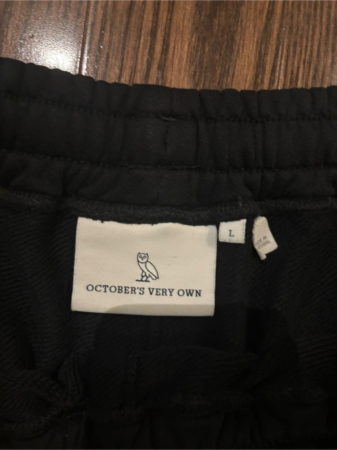 These are black sweat shorts from October's Very Own. They're a size large and feature the iconic OVO owl logo embroidered on the lower left leg.