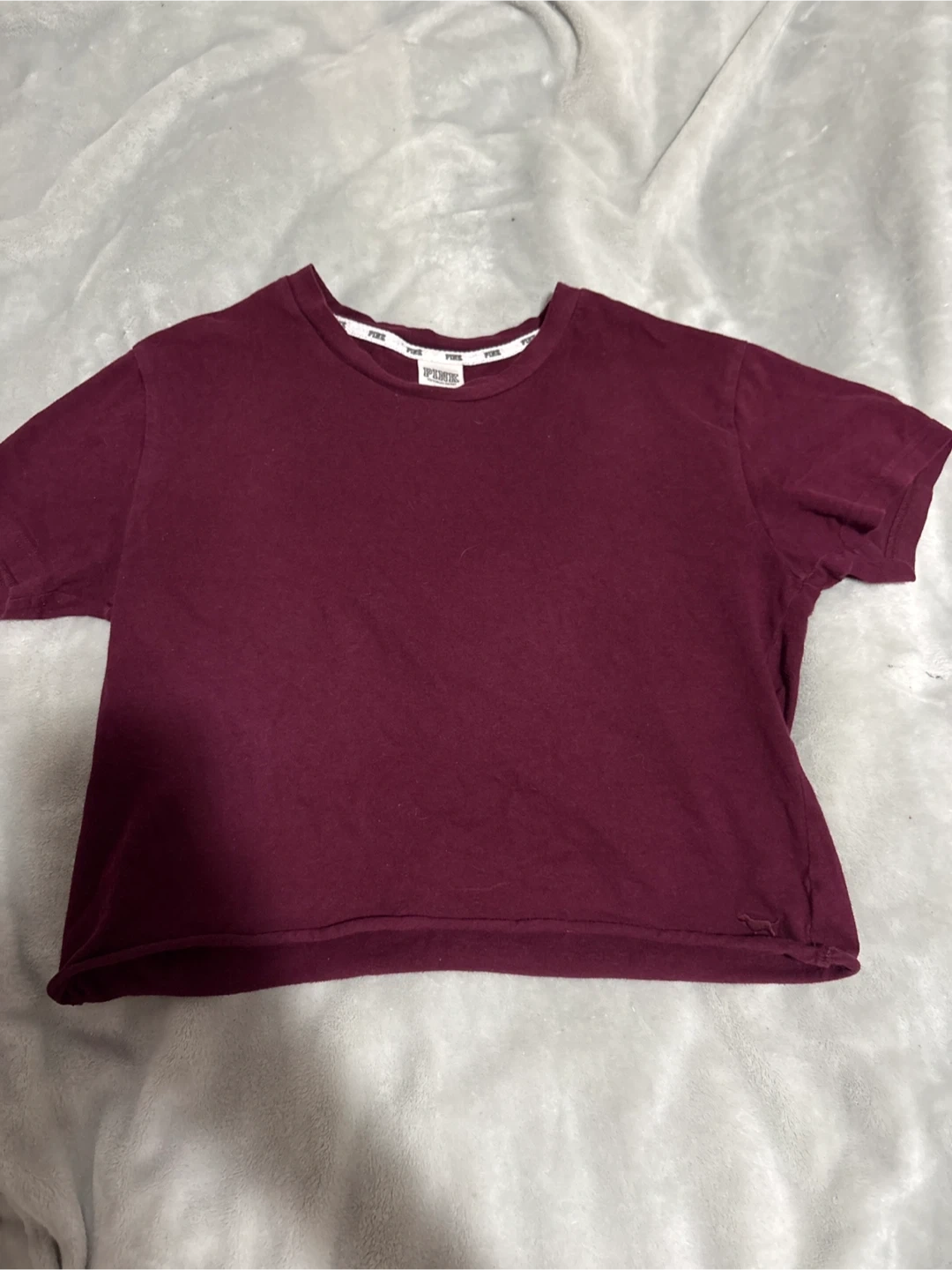 This is a Victoria's Secret PINK cropped t-shirt in maroon. It's a size XS and made in Vietnam. It's a comfy staple for casual wear!