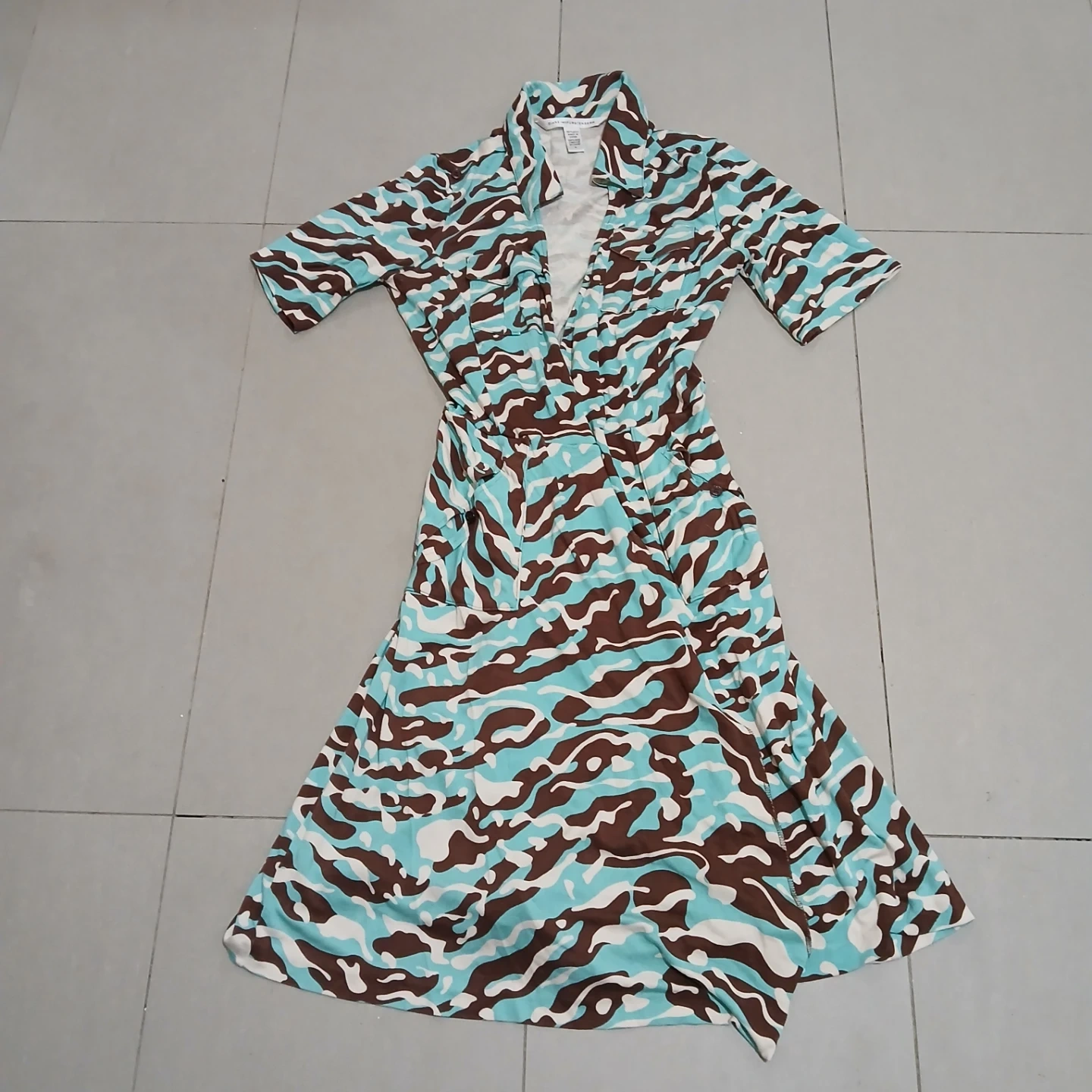 This DIANE von FURSTENBERG dress is made of 100% silk and features a unique camouflage print. It's a size 4 and perfect for adding a stylish touch to your wardrobe. Dry clean only.