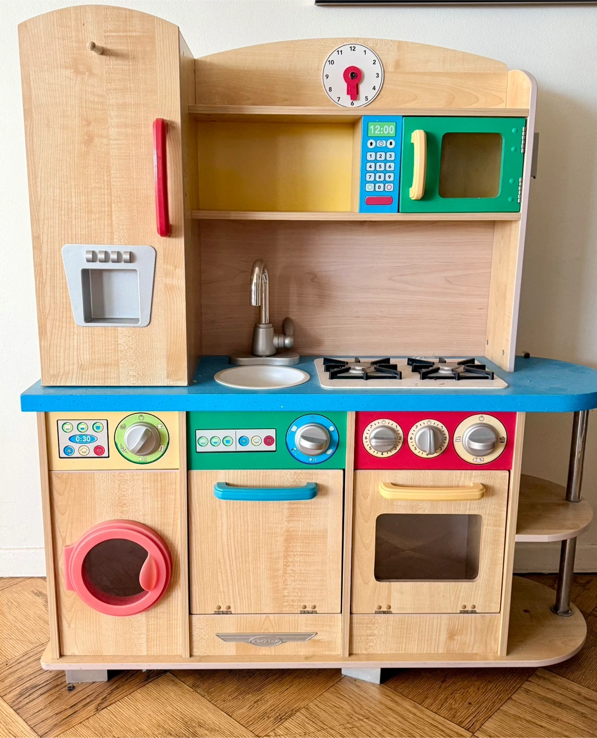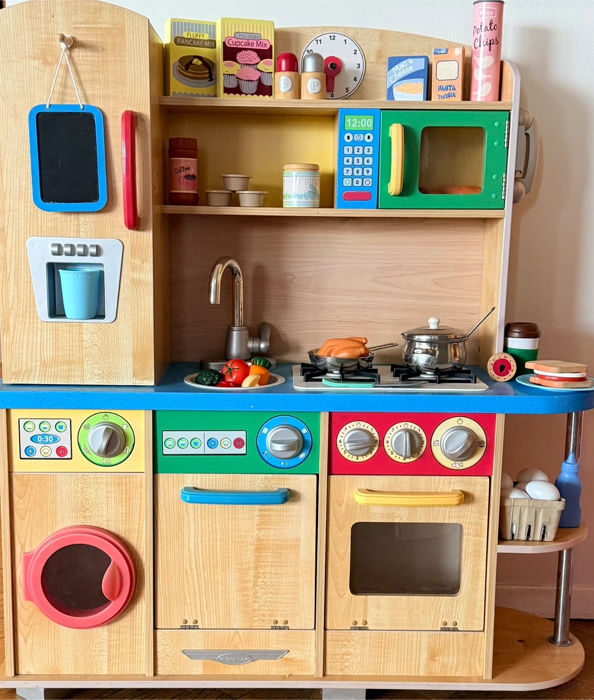This Melissa & Doug Chef's Pretend Play Kitchen is ready for a new little chef! It features a refrigerator with an ice dispenser, an oven, a stove, a microwave, a sink, and a washing machine. With adiciona kitchen tools and accessories included It's perfect for hours of imaginative play and developing culinary skills