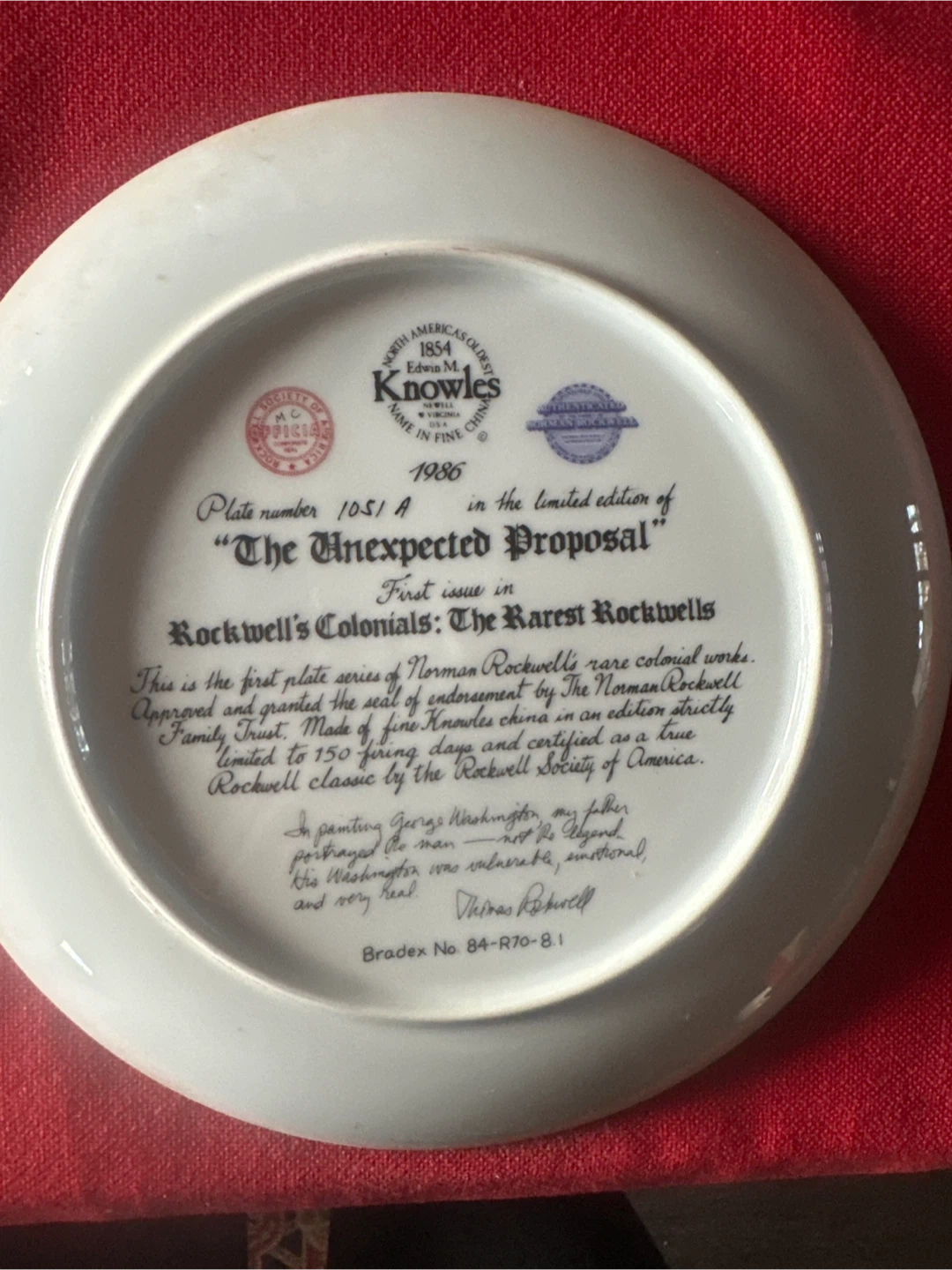This is the first plate in the "Rockwell's Colonials: The Rarest Rockwells" series. Made of fine Knowles china. Limited to 150 firing days. First issue plate.