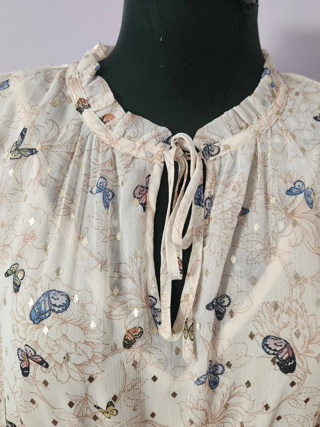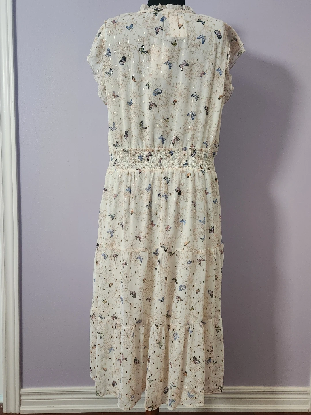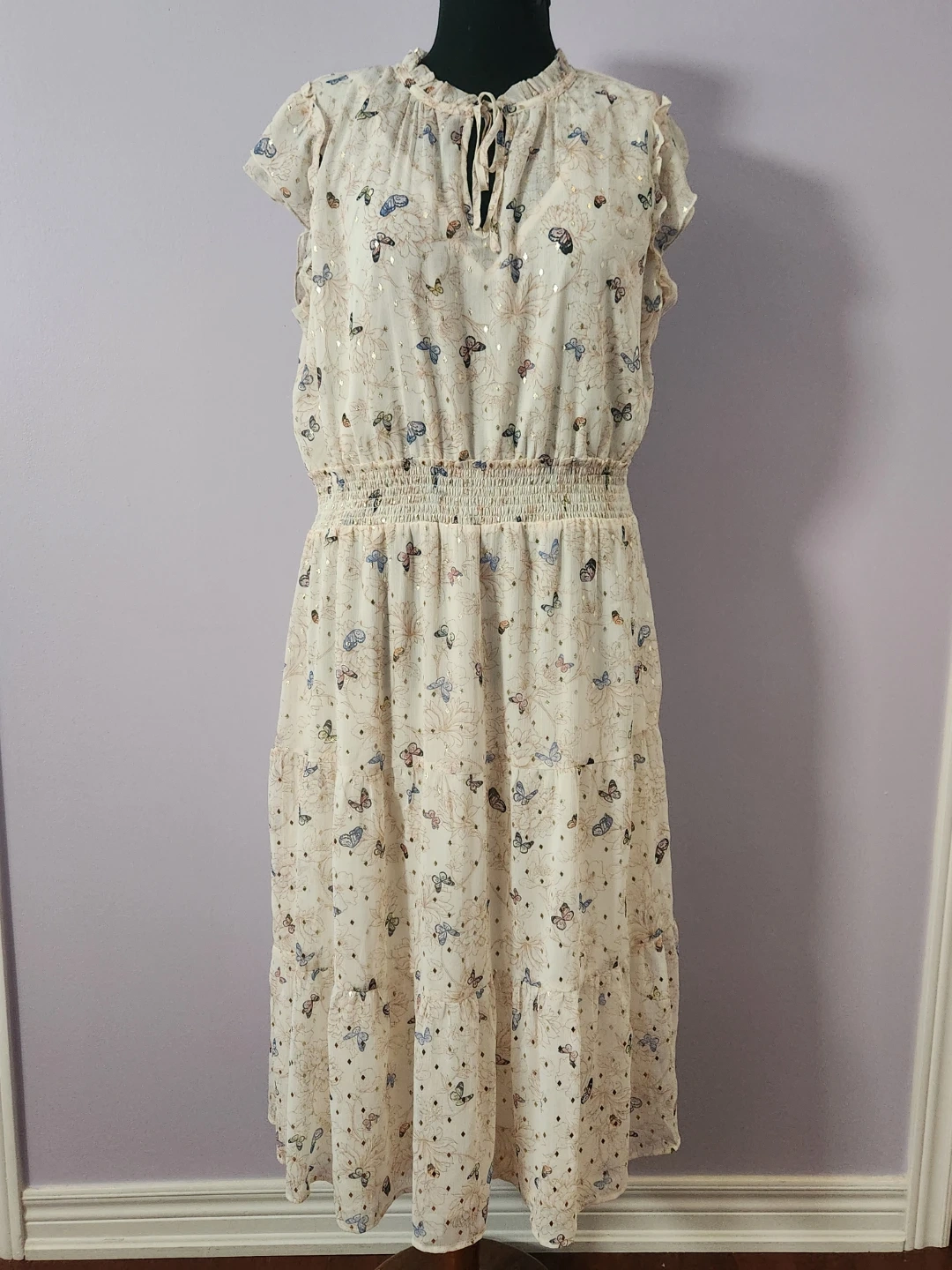 Tamara H. dress with a cute butterfly print. Ruffled neckline with a tie detail and a smocked waist. Elasticized cuffs on short sleeves. Lightweight fabric with a tiered skirt. Lots of stretch to it. Never worn. Has original tags. And has lining underneath. Size XL