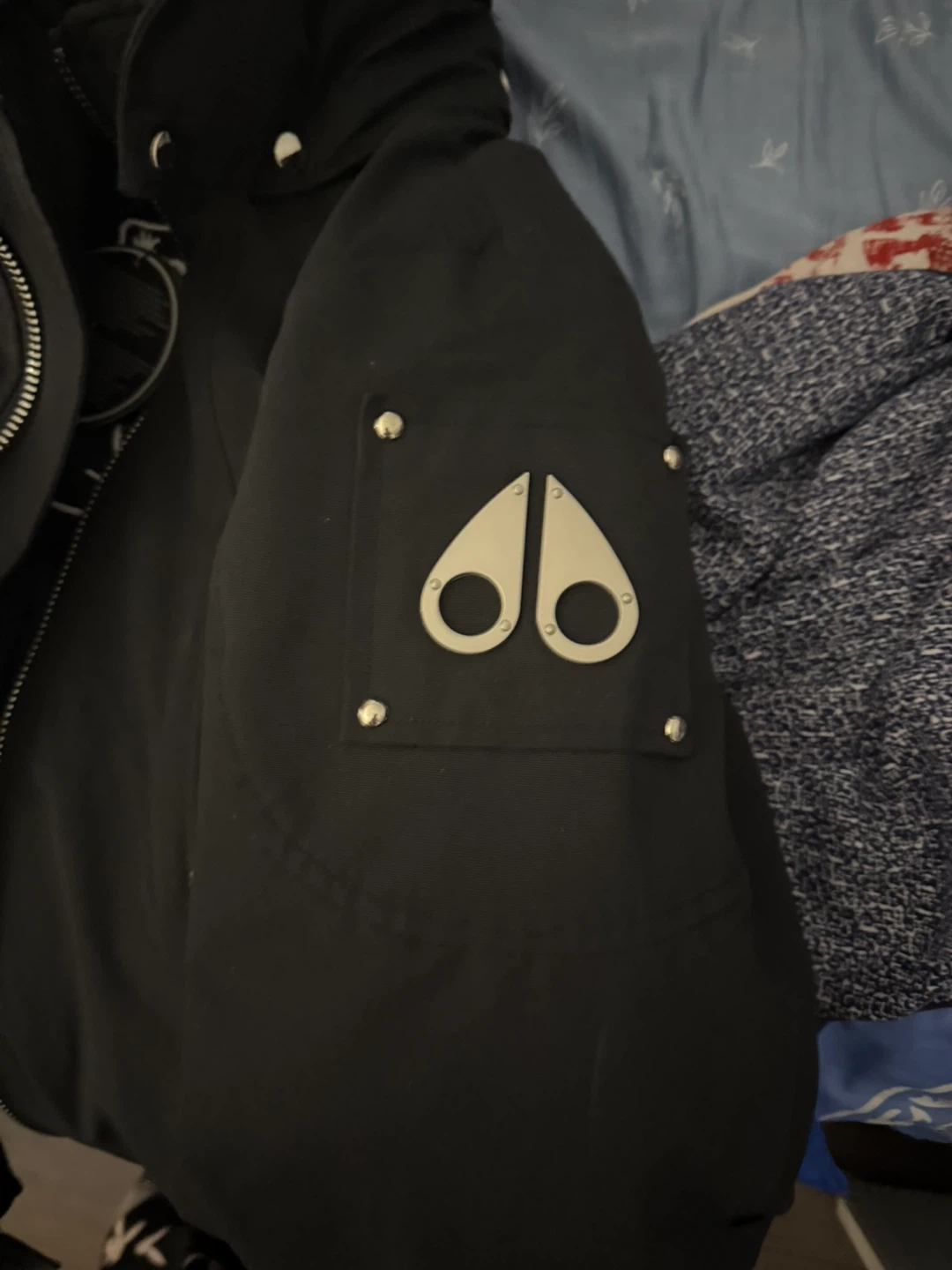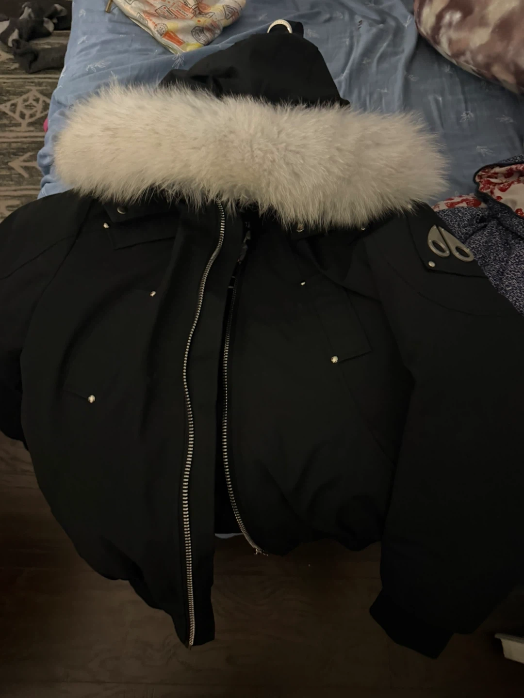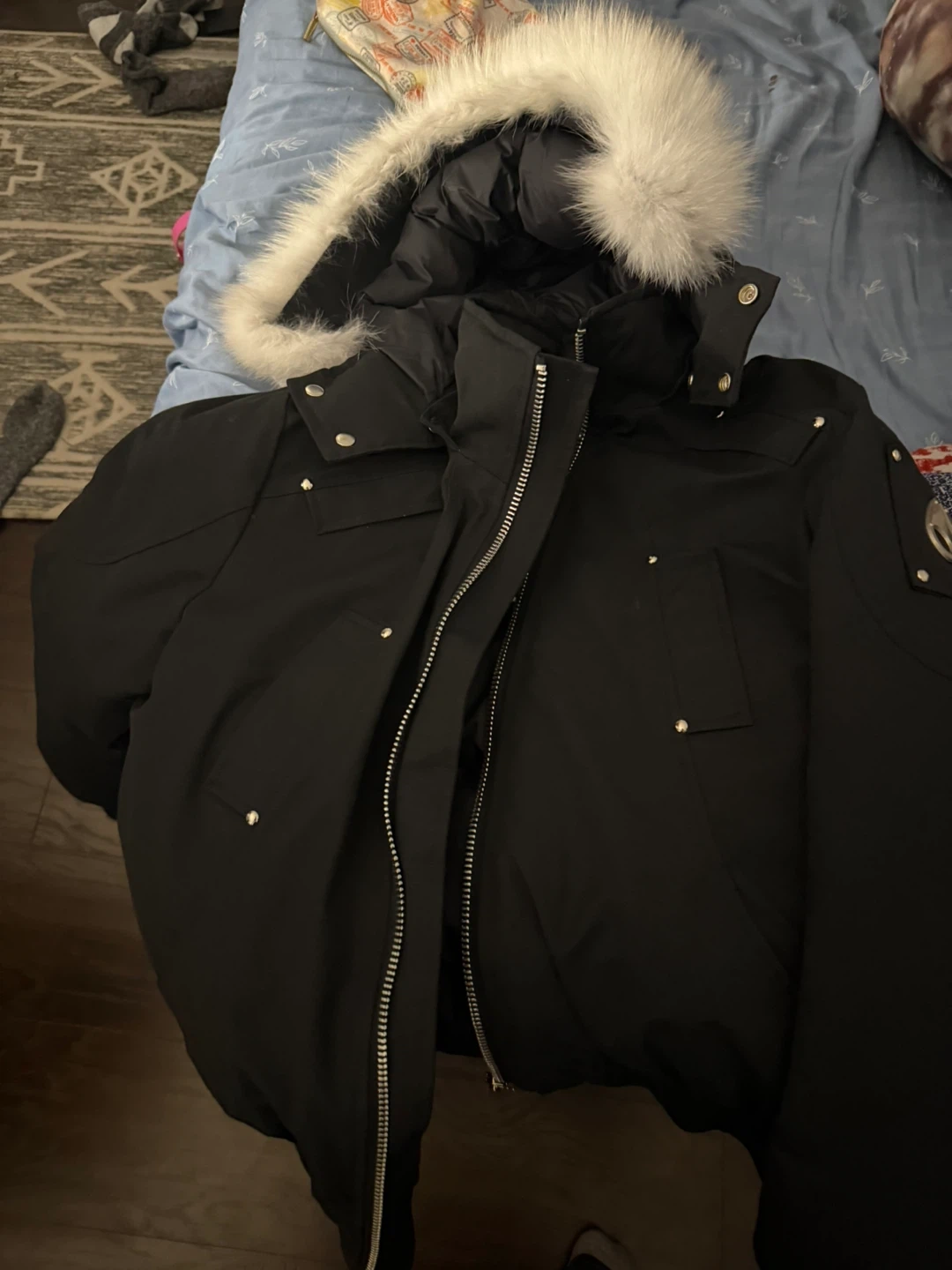This is a black Moose Knuckles bomber jacket with a distinctive white fur trim on the hood. It's designed for warmth and style. The jacket features a full zip front and multiple snap pockets.