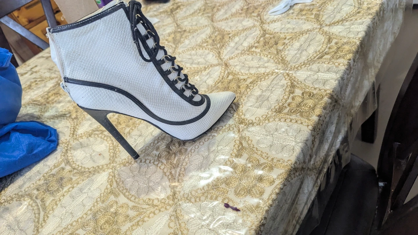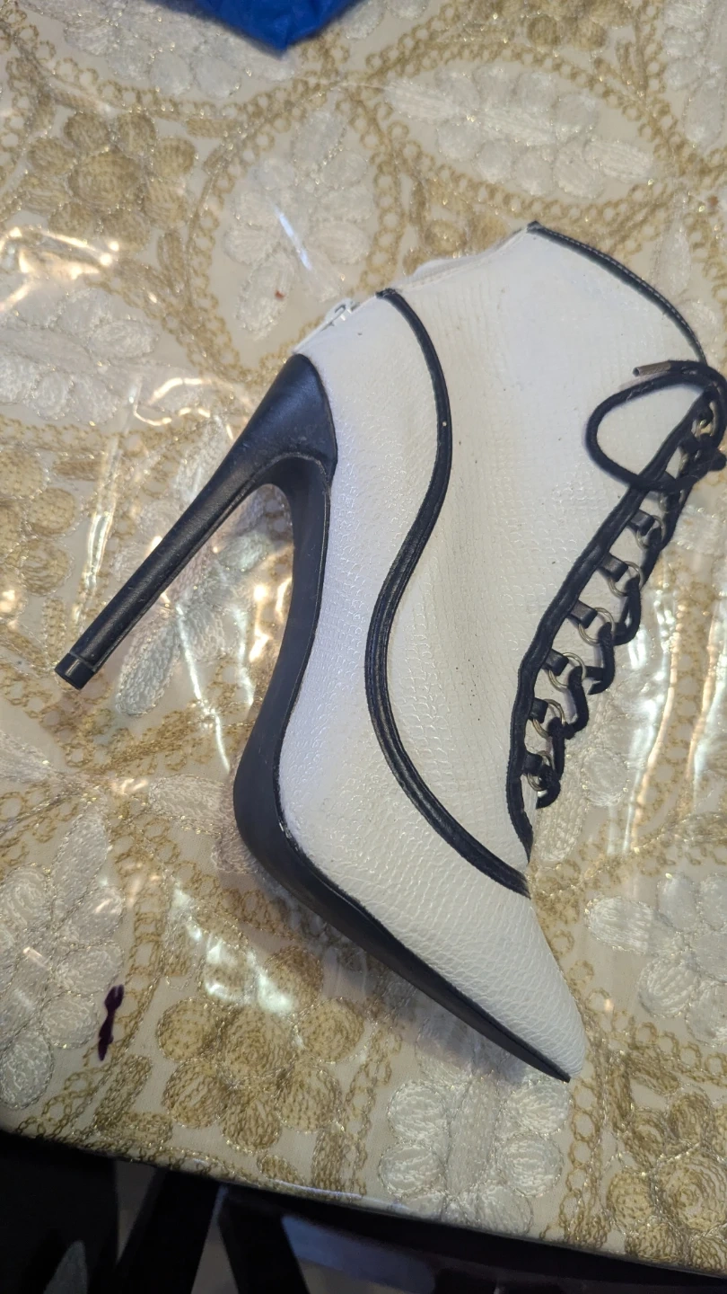 White stiletto ankle boots with black trim and lace-up front. These boots have a pointed toe and a high heel. They're designed with a textured faux leather material.size 6.5