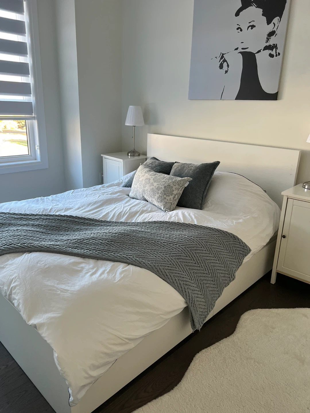 Selling a bedroom set that includes a bed frame, two side tables, and a piece of artwork. The set is in good condition and would be a great addition to any bedroom! Please feel free to reach out if you have any questions.