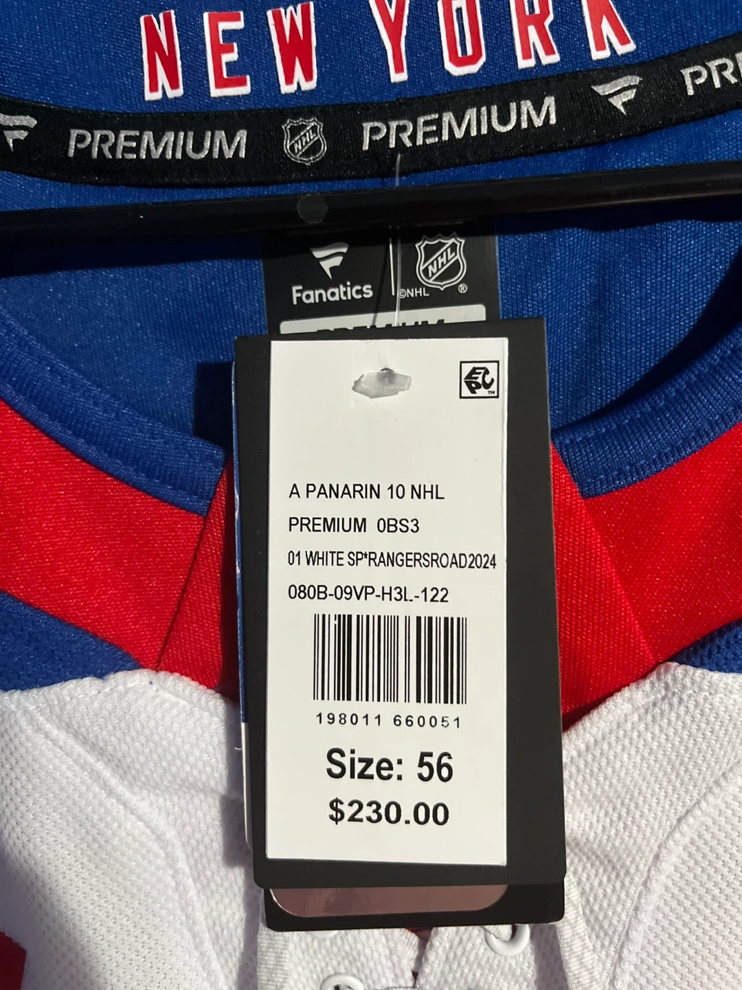 Selling a Fanatics New York Rangers jersey with Panarin's name and number 10. The jersey is a size 56. It's white with blue and red accents. The tag shows it originally cost $230