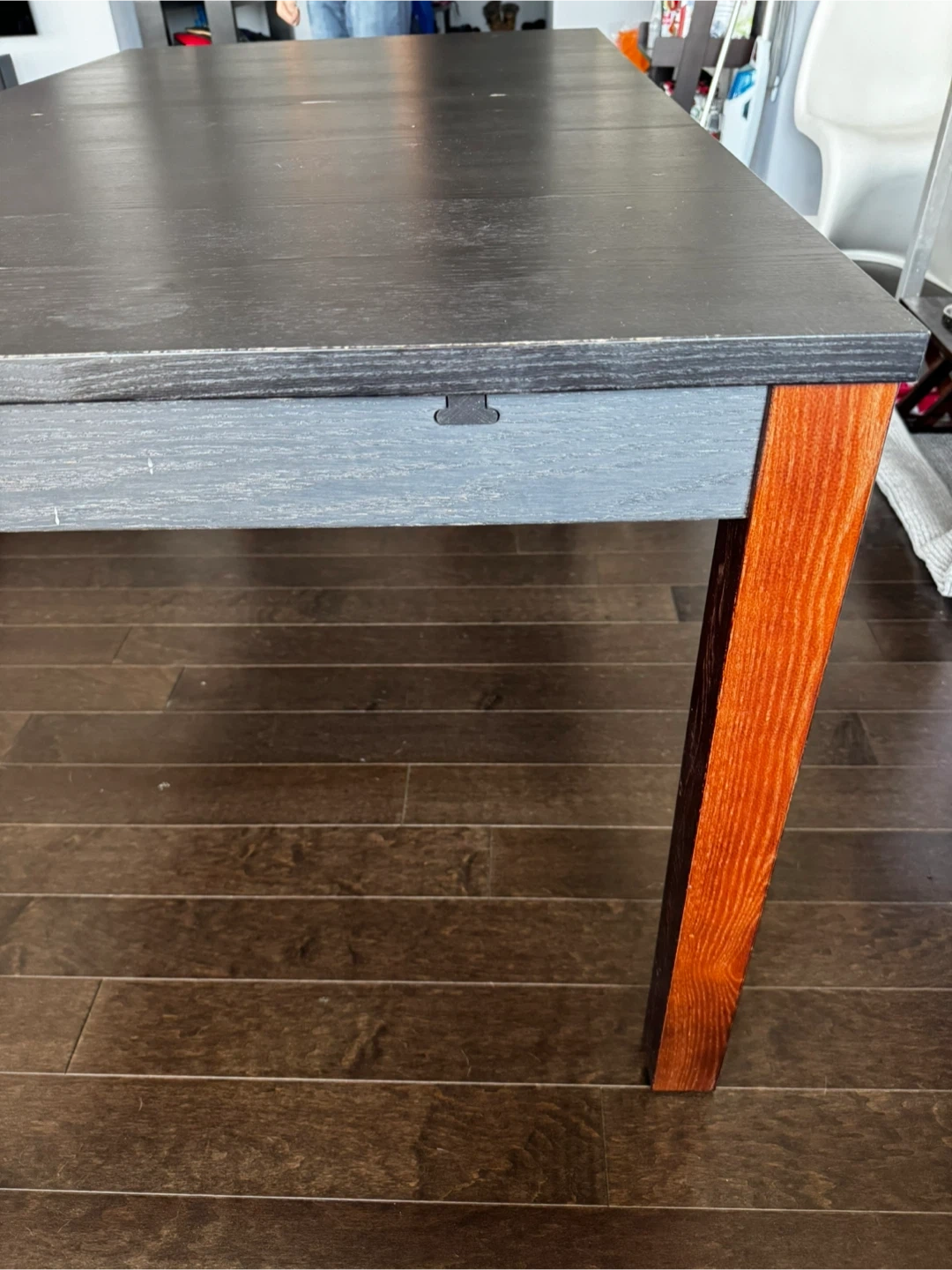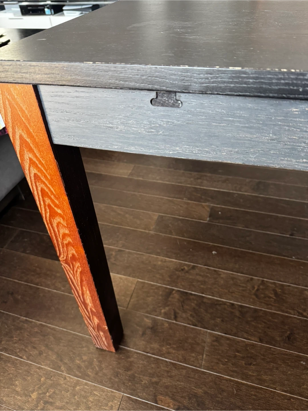 This dining table has a dark wood finish with some discolouration on the legs. It's a sturdy piece for your dining room. The table is long and can seat multiple people comfortably. It is from ikea from several years ago. Shows bubbling and surface imperfections.