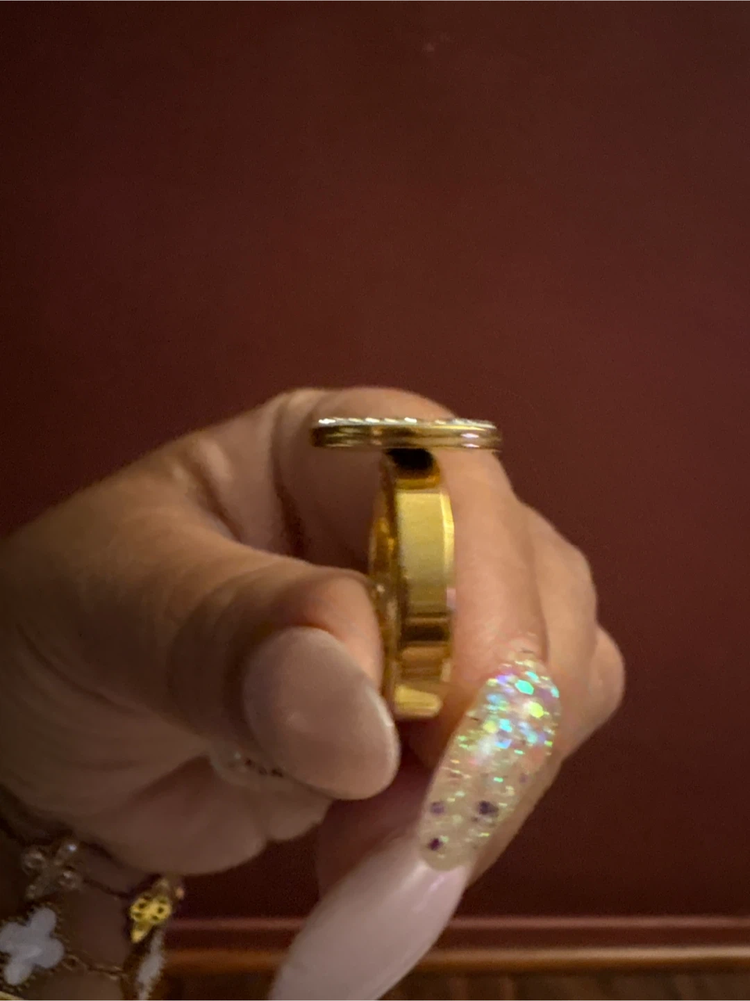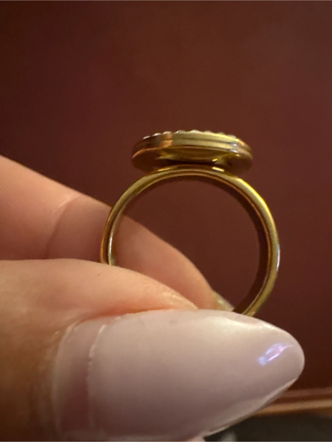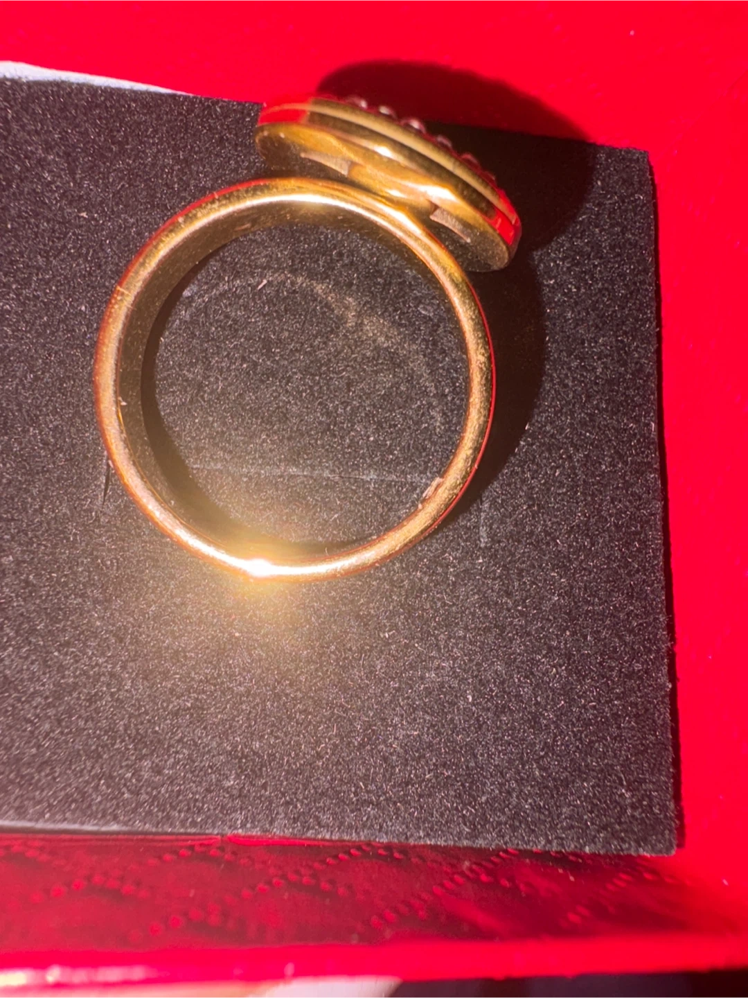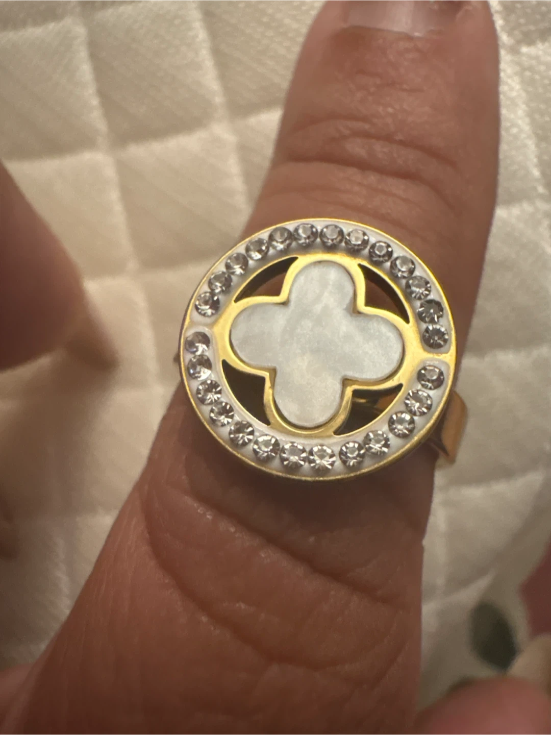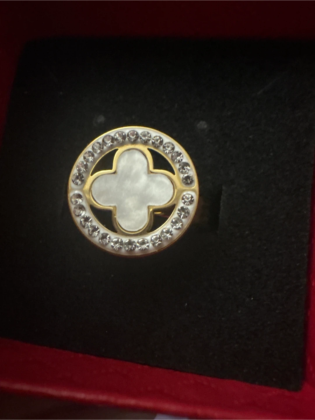 This is a 18K Gold Stainless Steel ring with a mother of pearl clover design surrounded by rhinestones. It's i New and comes in a box