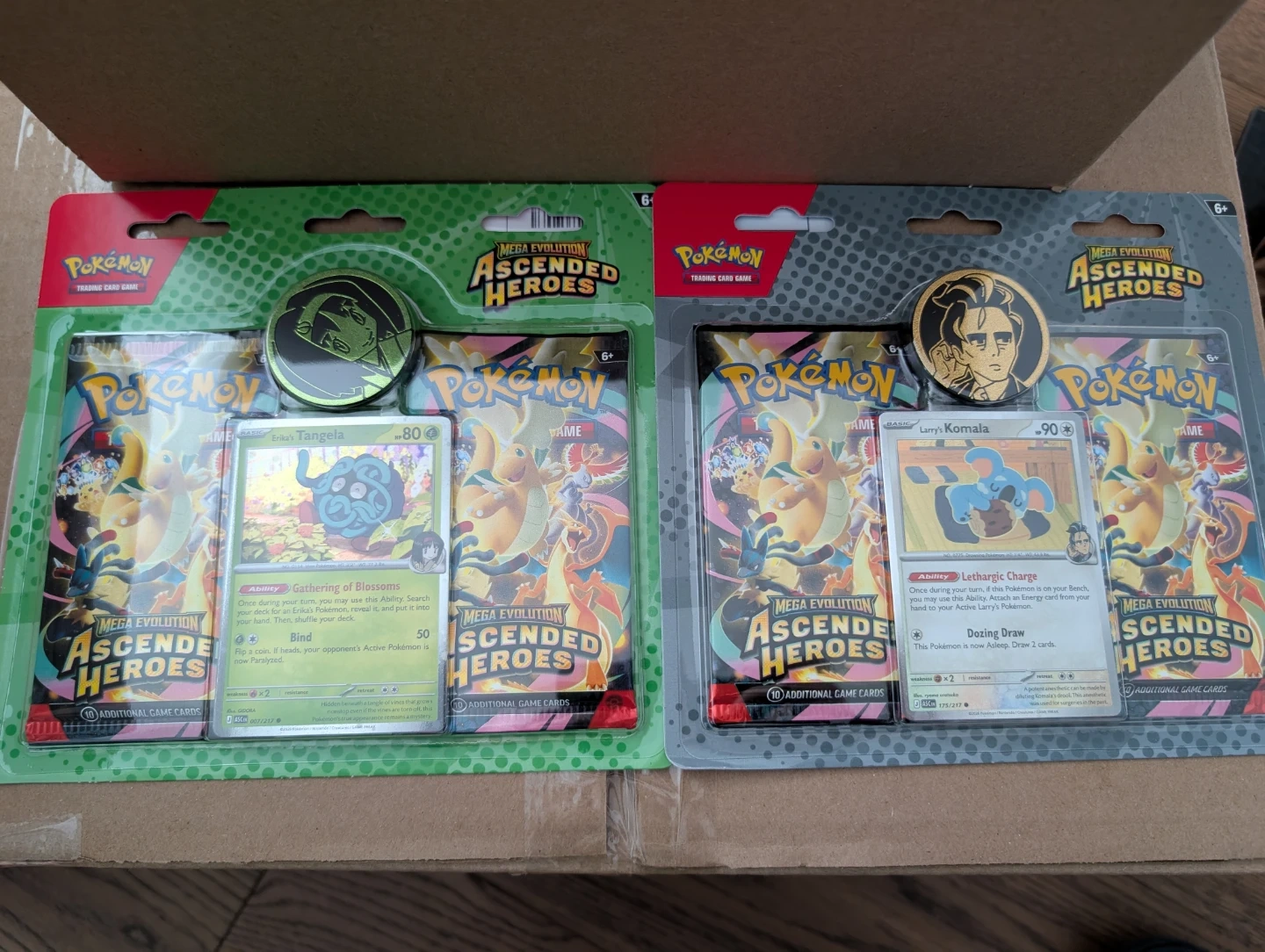 Two Pokémon Mega Evolution Ascended Heroes trading card game packs are included. Each pack contains booster packs and a special coin. Features include special Pokémon cards with unique abilities.