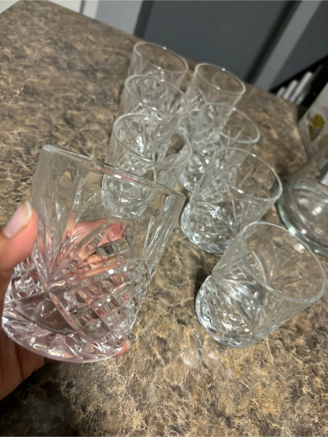 This is a set of six cut crystal old fashioned glasses. They have a classic diamond and fan pattern. These glasses are perfect for serving spirits or cocktails.