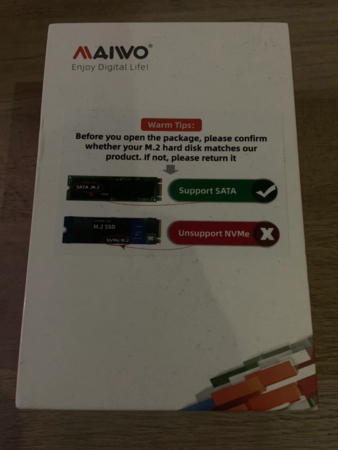 External enclosure for M.2 SATA SSD. Includes USB cable and user manual. Supports SATA M.2 SSDs, not NVMe.
