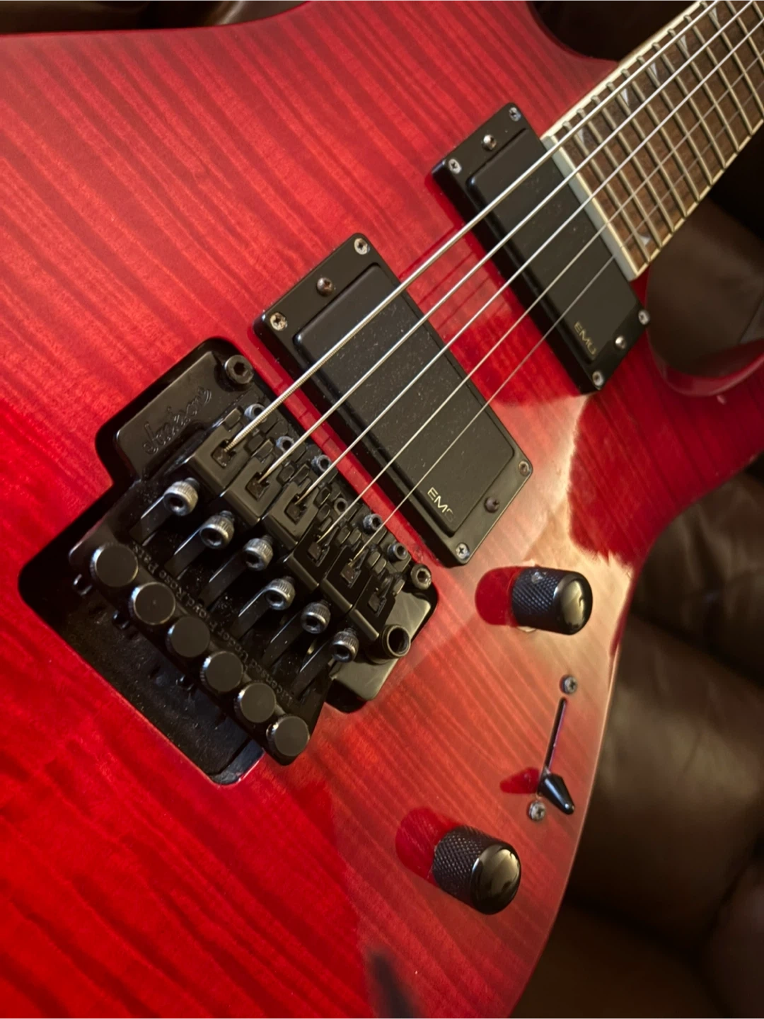 Up for grabs is a red Jackson DKMG electric guitar made in Japan. It's got a sleek, quilted maple top and black hardware. This axe is ready to rock!
