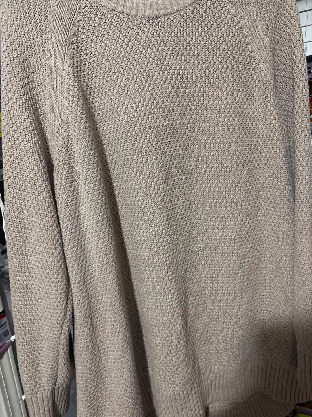 A cozy, textured knit sweater in a light cream colour. It's a raglan sleeve style with a ribbed neckline and hem. This sweater is a nice weight for cooler days!