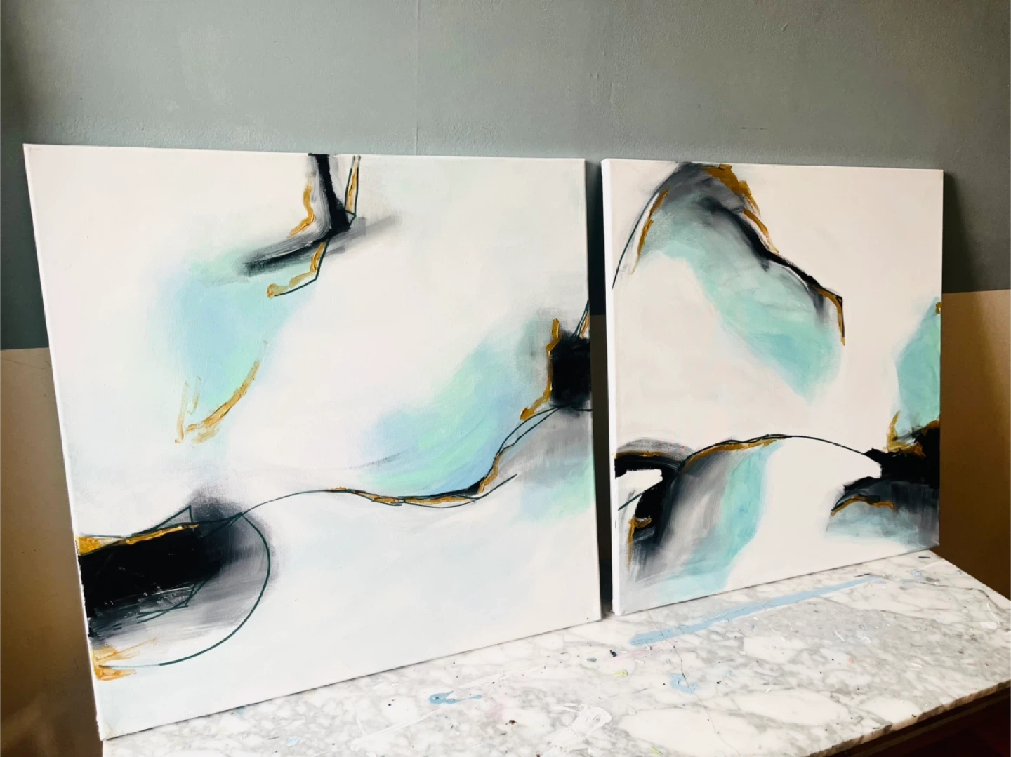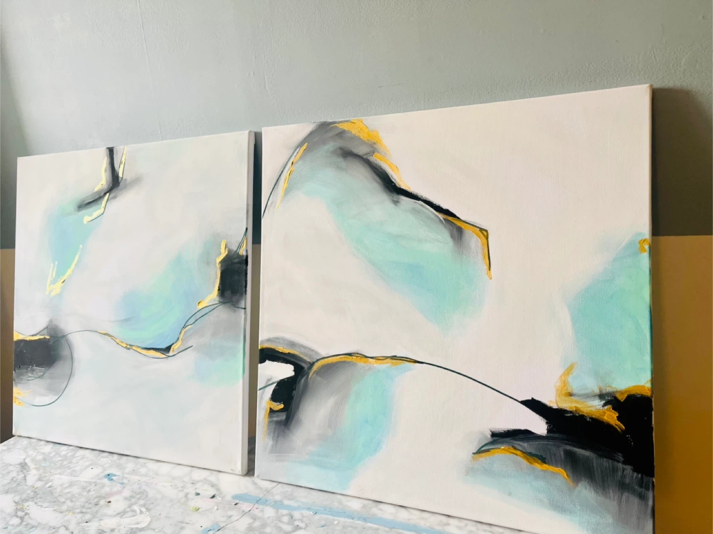 Set of two 2 ft x 2 ft abstract acrylic paintings on canvas. Features teal, gold, black, and grey tones with textured accents. Thick brushwork highlights. Can hang any orientation. Each piece has a minimalist, modern design that complements various decor styles. Ready to hang!