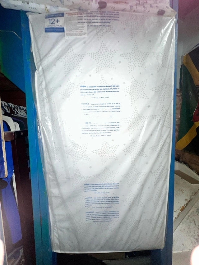 This is a brand new Simmons crib mattress, designed to provide a firm and comfortable sleeping surface for your little one. It's still in its original packaging, ensuring it's clean and ready for use. Designed for infants and toddlers, it features a water-resistant cover and firm support. It's lightweight for easy changing. Let me know if you're interested!