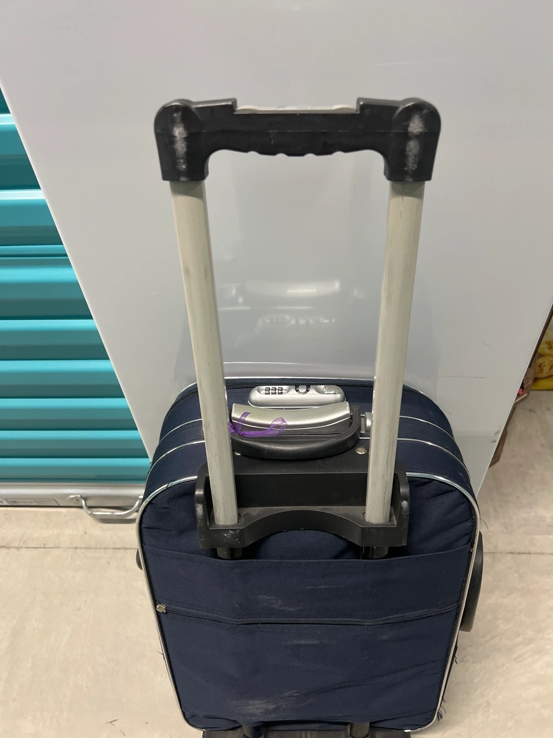 Navy blue soft-sided spinner suitcase with telescopic handle and built-in combination lock. It has four spinner wheels for easy maneuverability. Includes a purple ribbon tied to one of the handles.