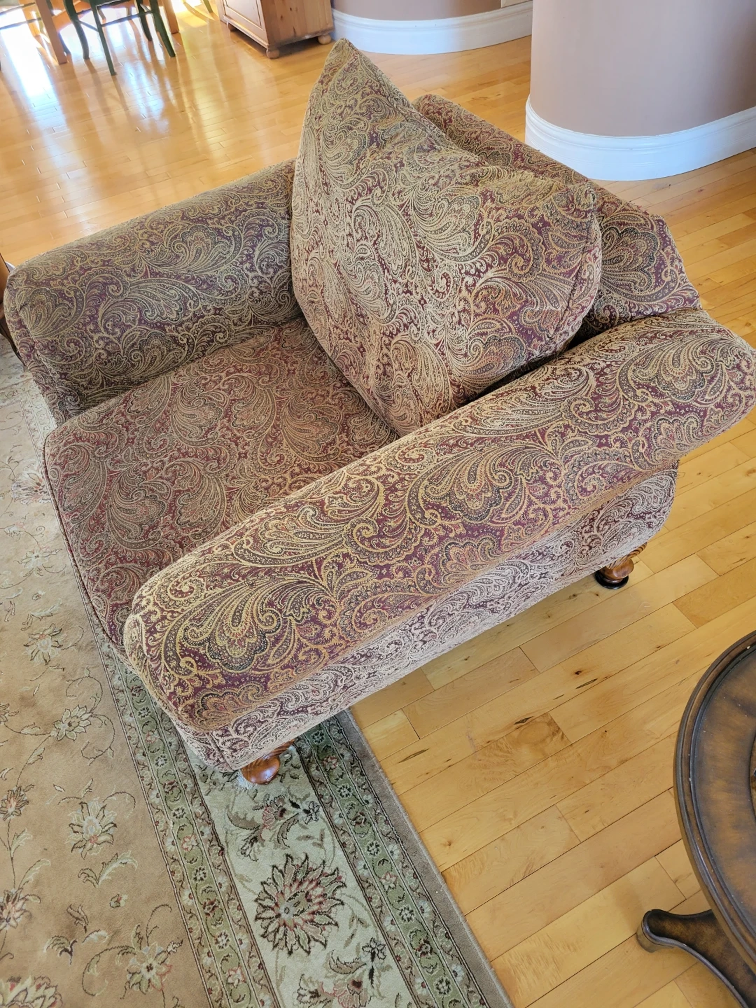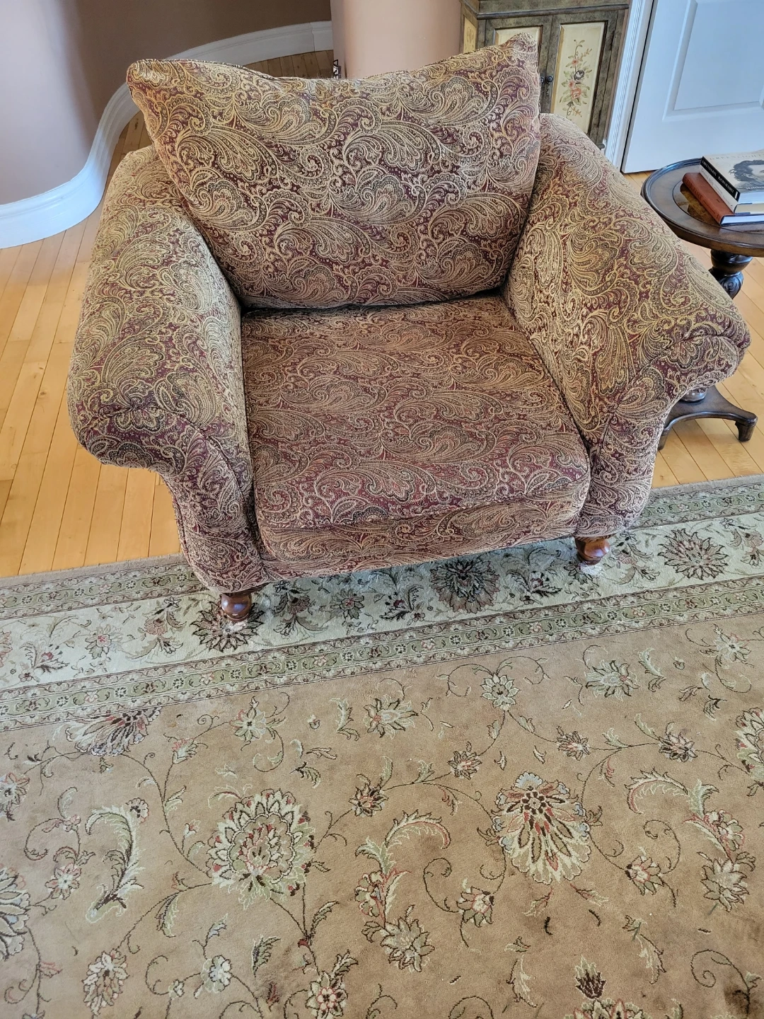 This comfy accent chair features a classic paisley pattern in deep reds and golds. It's upholstered in a durable fabric and has nicely carved wooden legs. The chair offers a stylish seating option for any room.