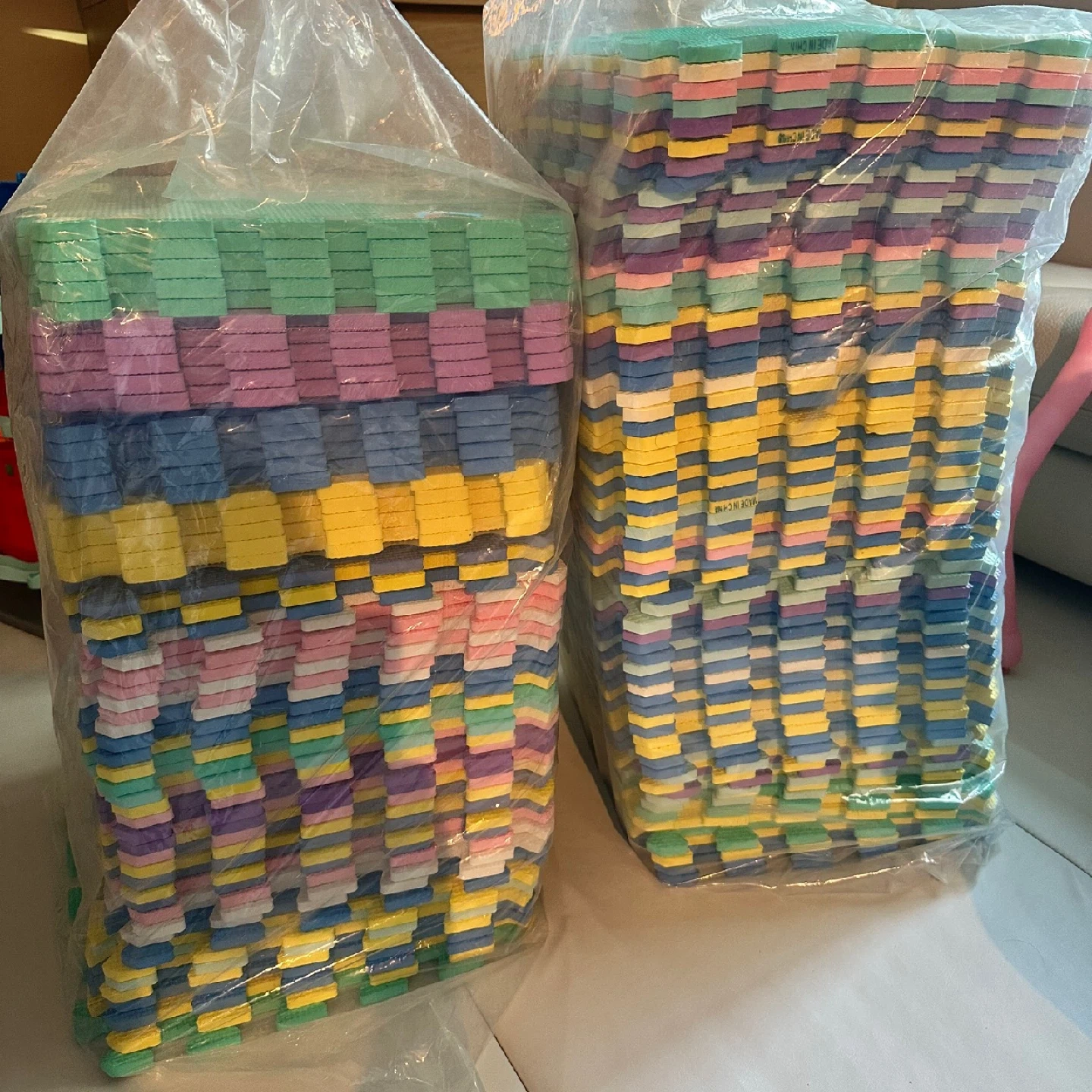 Set of interlocking foam play mat tiles in a variety of bright colours.