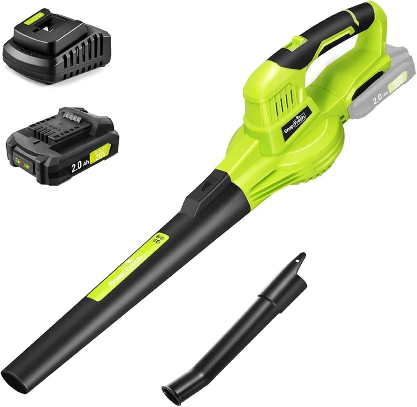 This is a Snap Fresh cordless leaf blower, model BBT-YOR01. It's a 20V tool with a 2000 mAh battery. The blower measures 34.8 inches (88.5cm) long and 5.71 inches (14.51cm) high. It comes with batteries and a rapid charger.