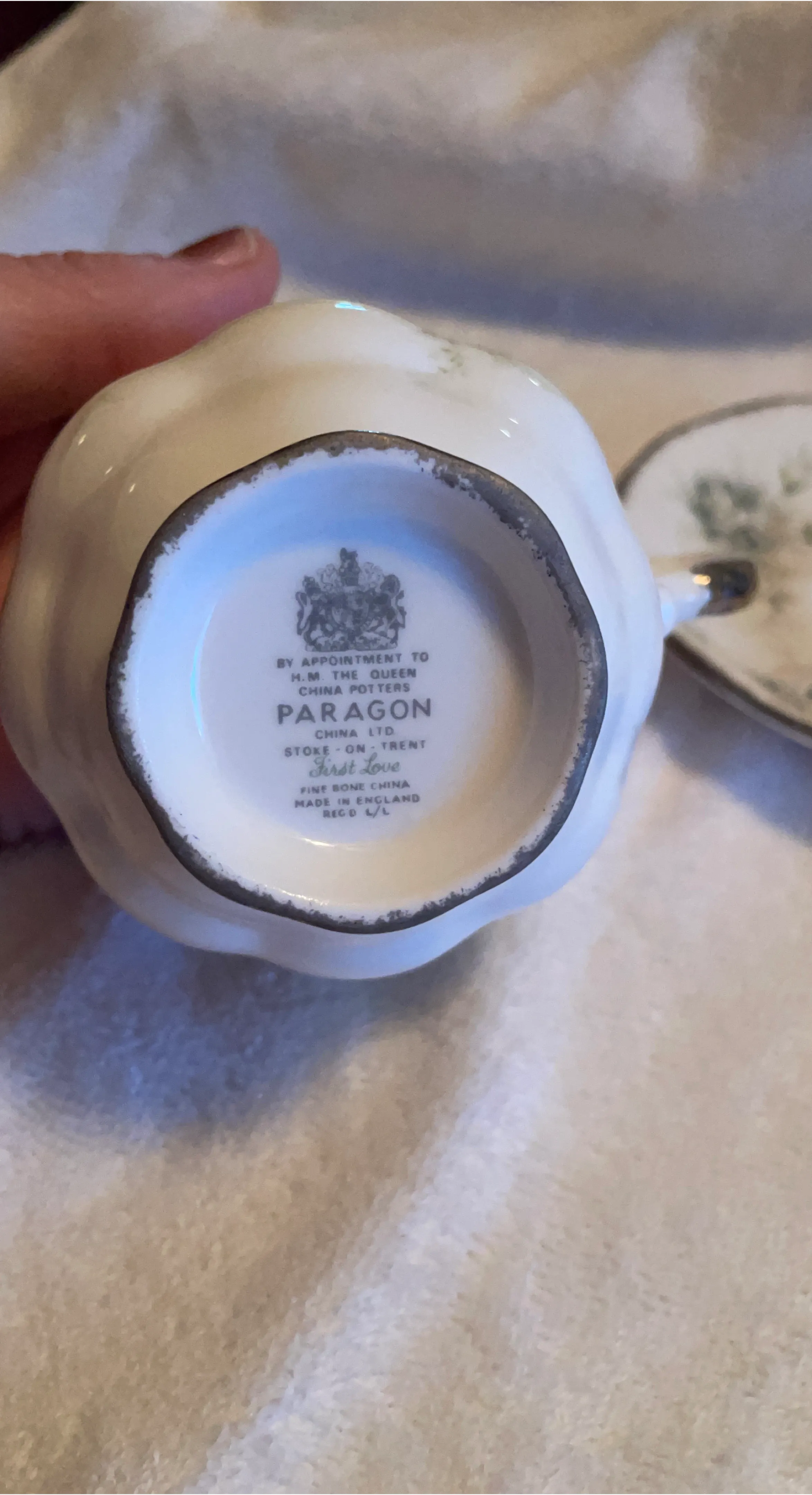 This is a Paragon fine bone china cup and saucer set from the 'First Love' collection. Made in England by Paragon China Ltd in Stoke-on-Trent. The set features a classic design with a gold rim.