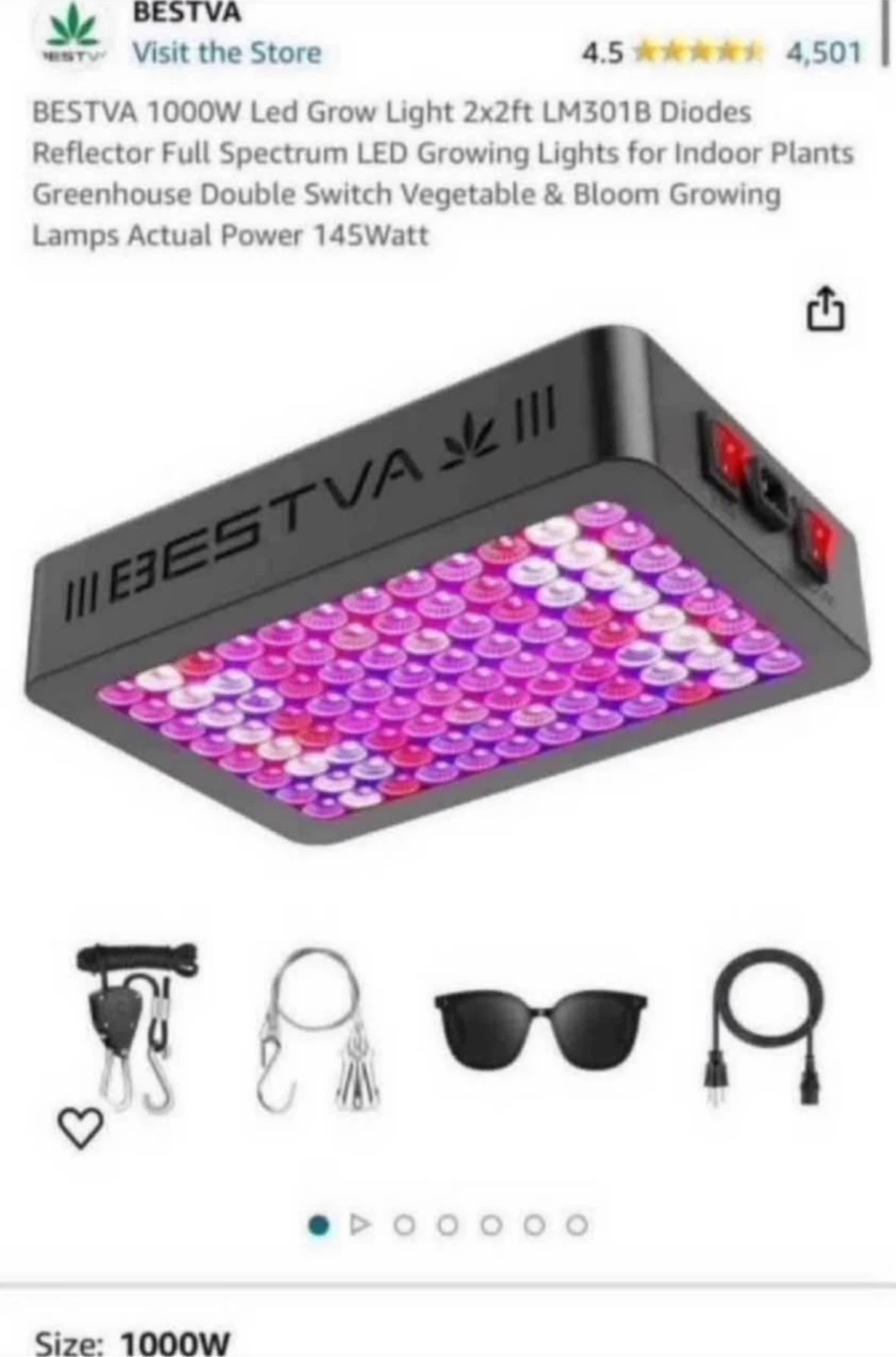 This BESTVA 1000W LED grow light features LM301B diodes and a full spectrum output. It's designed for indoor plants, greenhouses, and vegetable & bloom growth. Actual power consumption is 145 Watts.