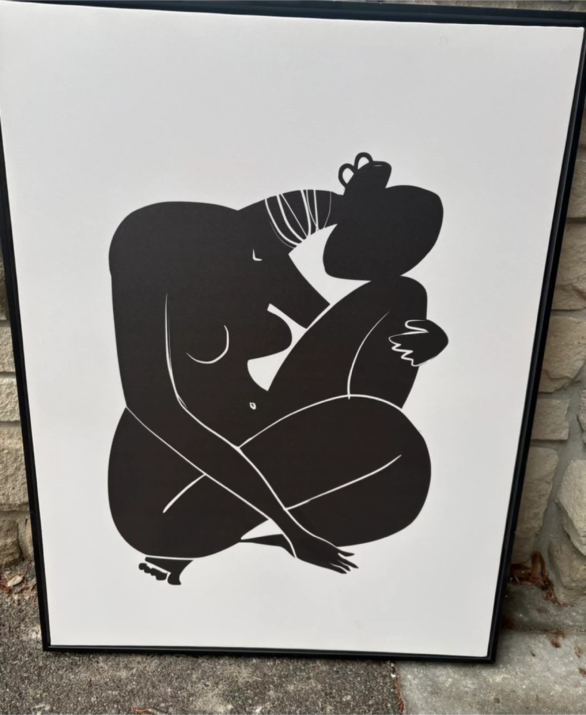 Art print featuring a silhouette of a seated figure in black ink on a white background. It's framed in a simple black border. This piece adds a minimalist touch to any room.