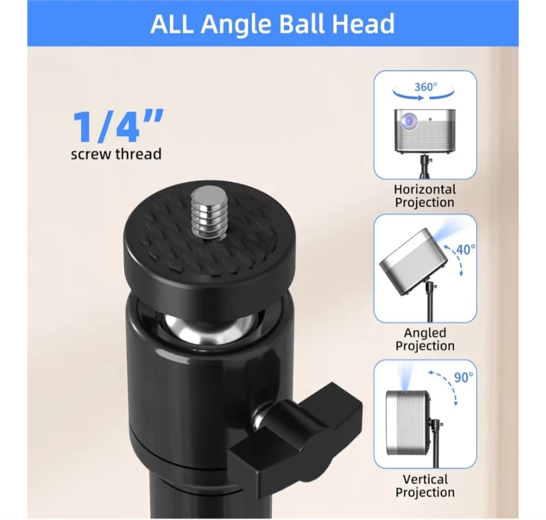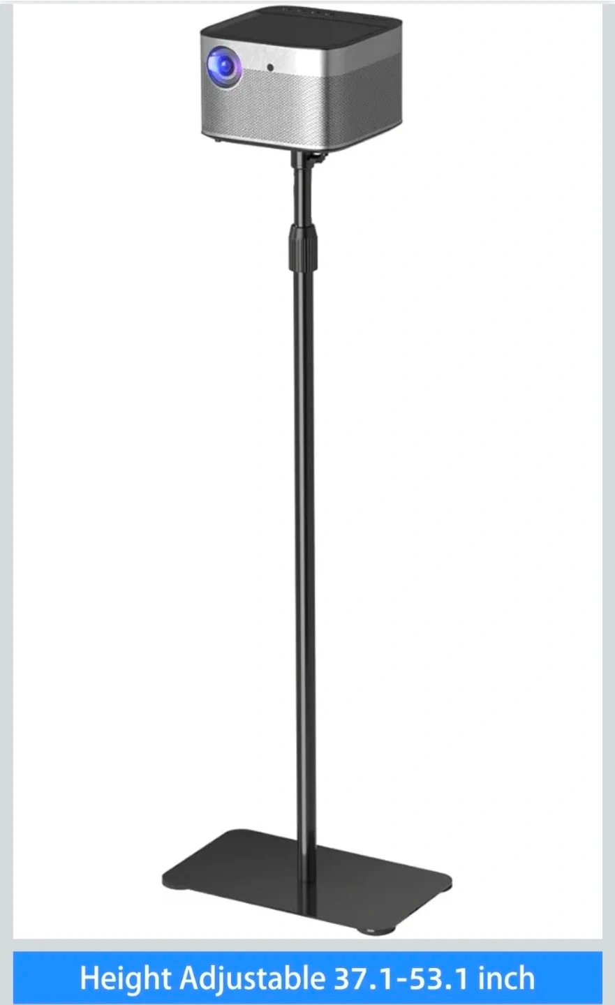 This is a versatile projector floor stand with a 1/4" screw thread mount. It's height adjustable from 37.1" to 53.1" and features a stable metal base with a rubber pad. The ball head allows for all-angle projection.