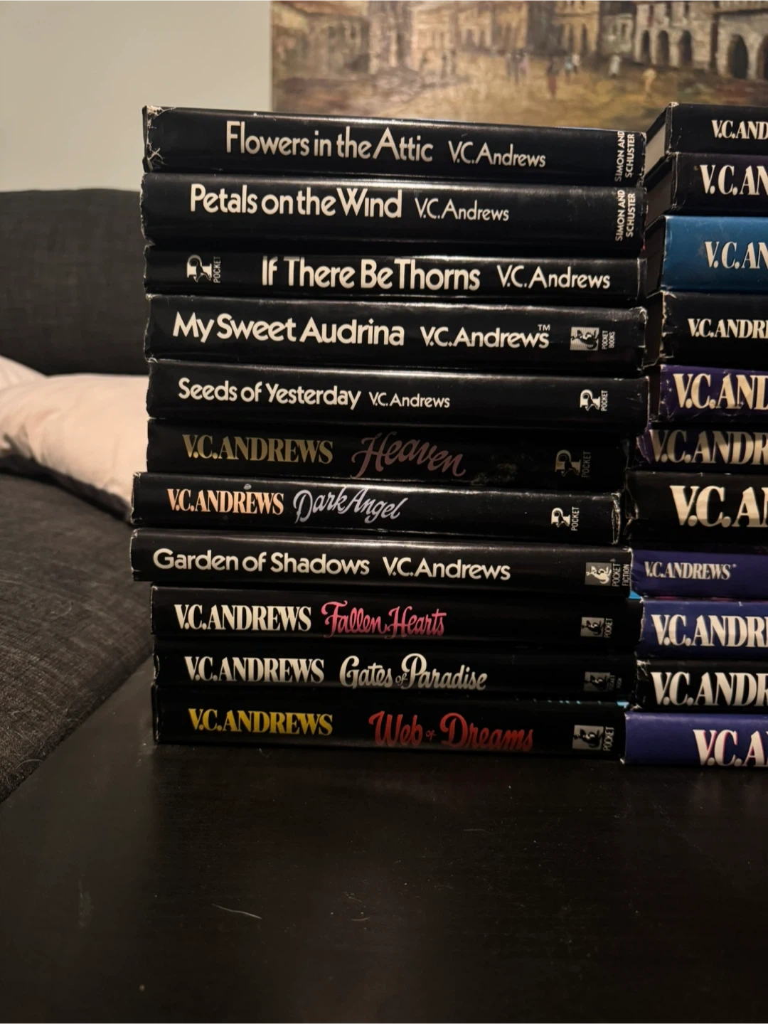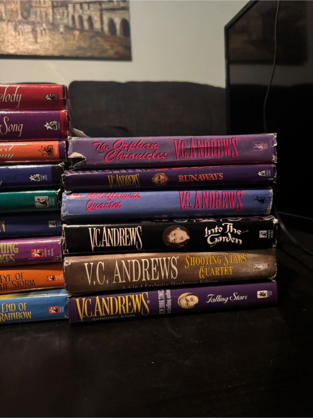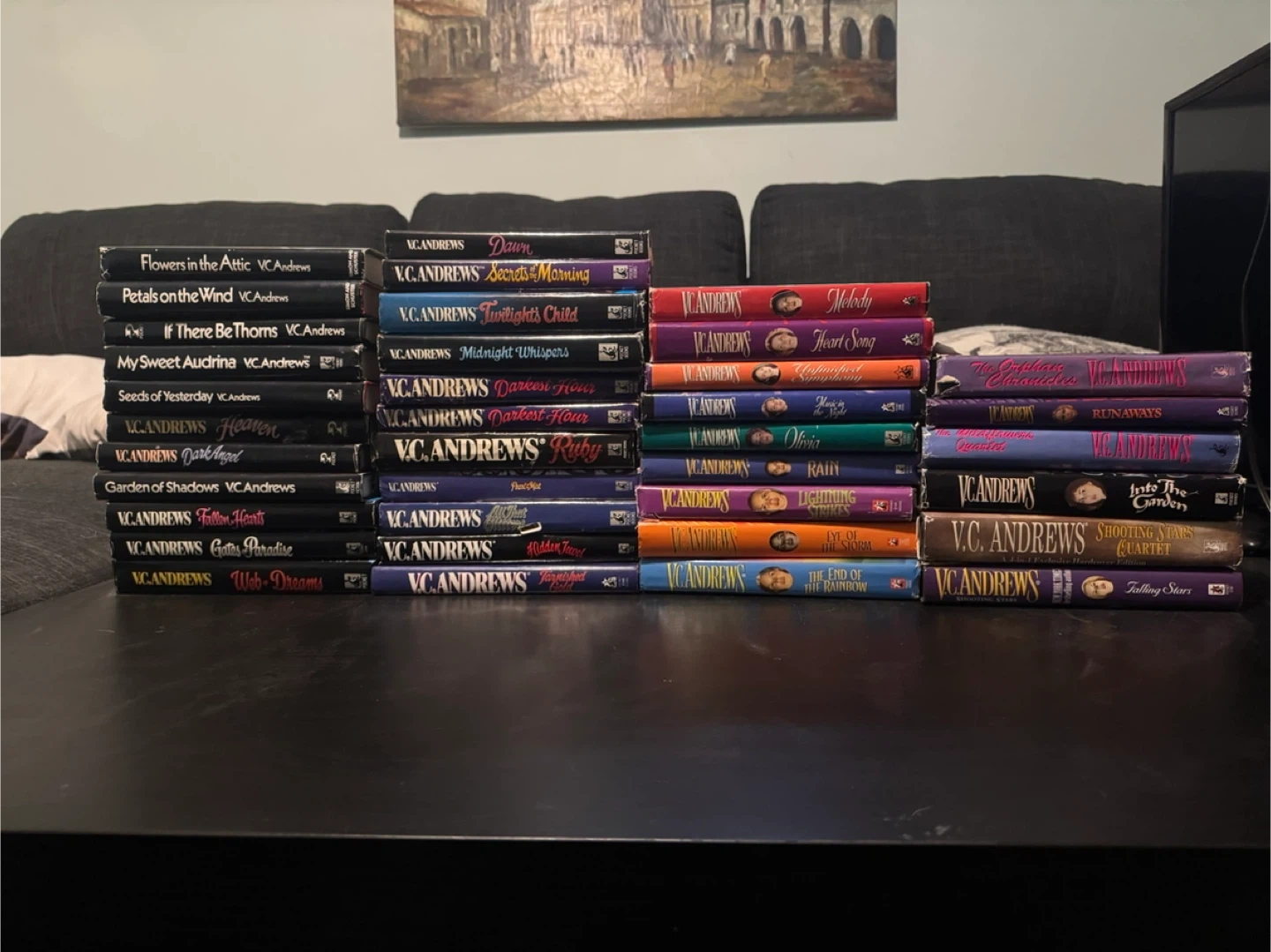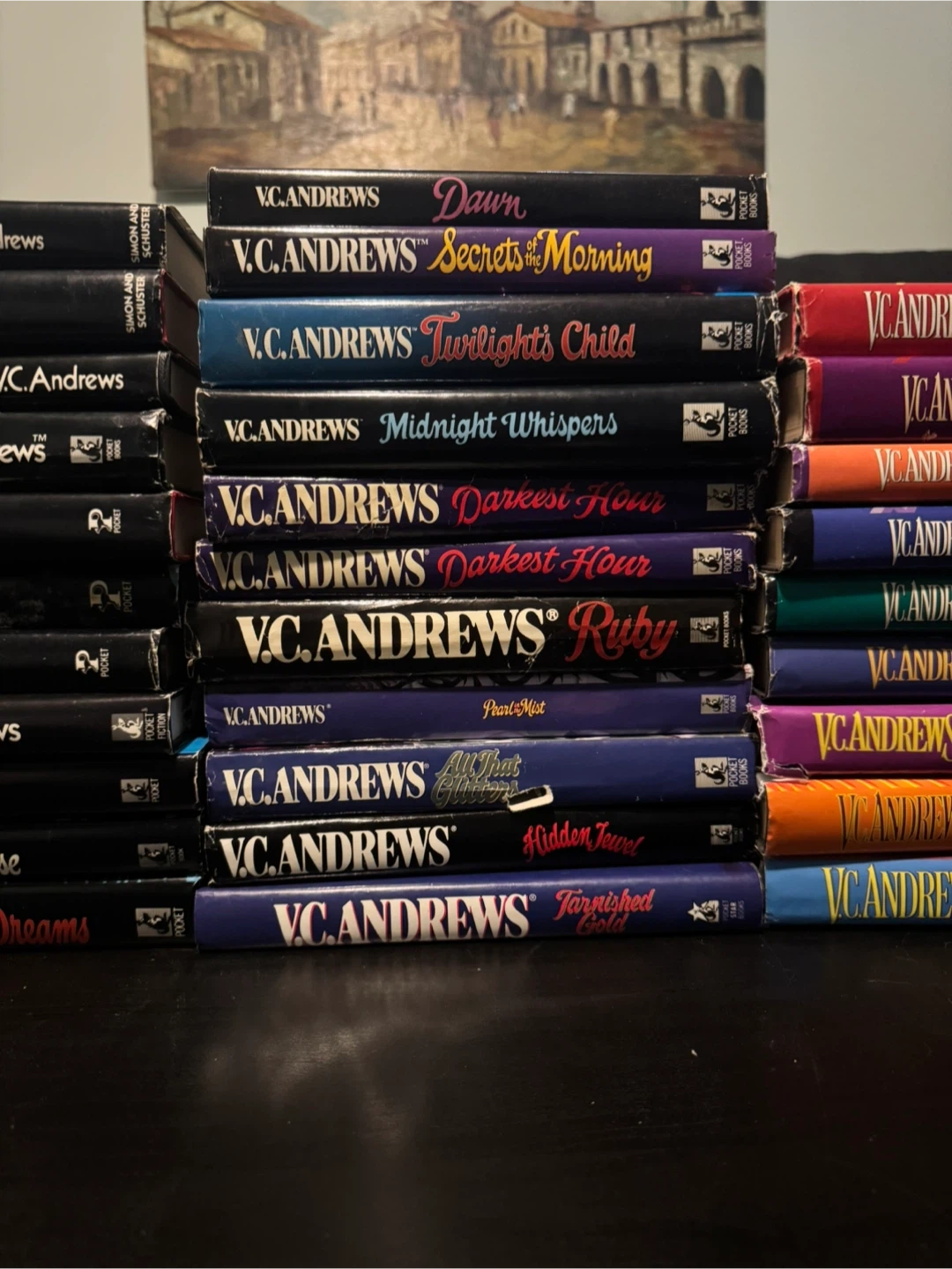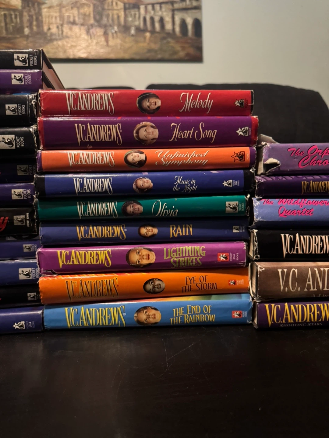 Selling a collection of V.C. Andrews novels! Titles include Dawn, Secrets of the Morning, Twilight's Child, Midnight Whispers, Darkest Hour, Ruby, Pearl in the Mist, All That Glitters, Hidden Jewel, Tarnished Gold, Melody, Heart Song, Unfinished Symphony, Music in the Night, Olivia, Rain, Lightning Strikes, Eye of the Storm, The End of the Rainbow, The Orphan Chronicles, Runaways, Shooting Stars Quartet, Falling Stars, Flowers in the Attic, Petals on the Wind, If There Be Thorns, My Sweet Audrina, Seeds of Yesterday, Heaven, Dark Angel, Garden of Shadows, Fallen Hearts, Gates of Paradise, and Web of Dreams