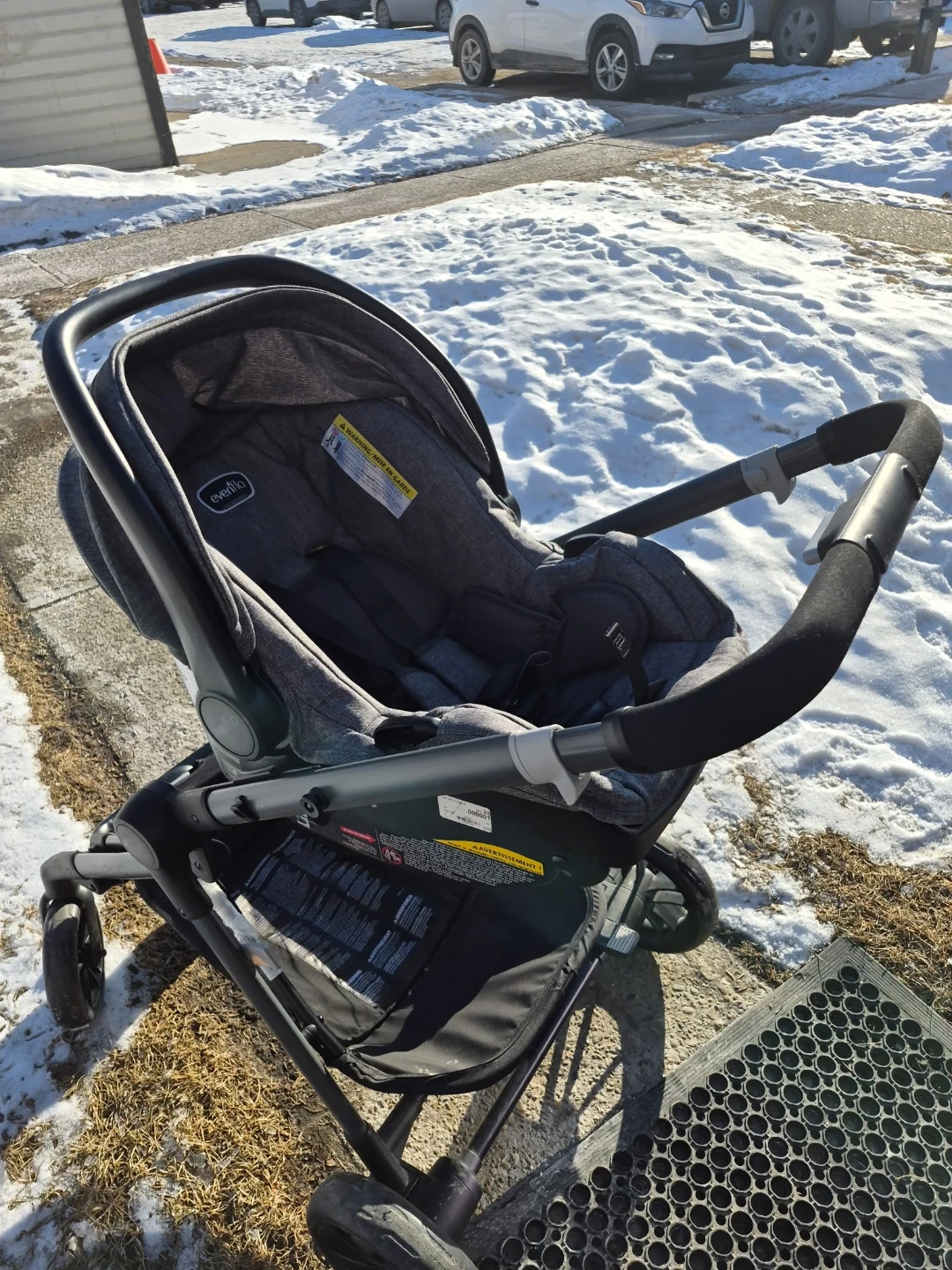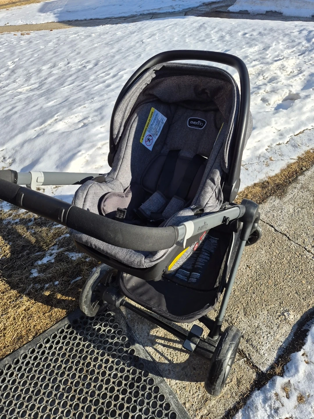This Evenflo travel system includes an infant car seat and a stroller. It's designed for convenience and ease of use for parents on the go. The car seat clicks securely into the stroller base.