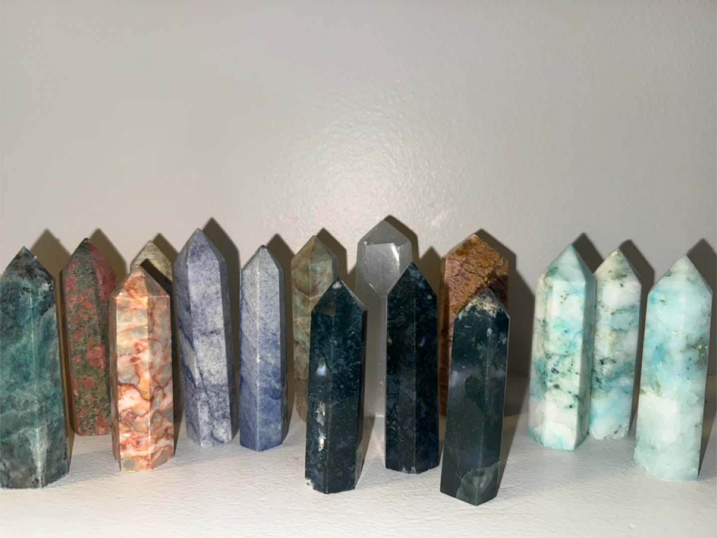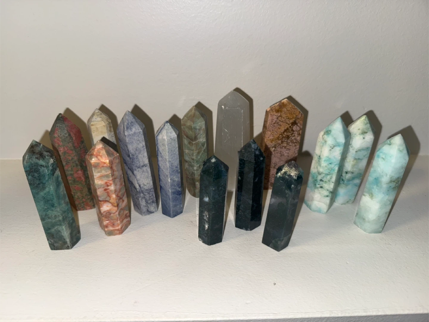 A collection of 15 assorted crystal towers in various unique colours and patterns. They're great for collecting, decoration or display!