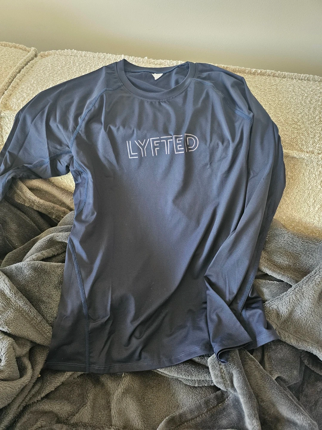 This LYFTED long sleeve shirt is dark navy. It's made of a lightweight, moisture fabric. It's great for workouts or casual wear!