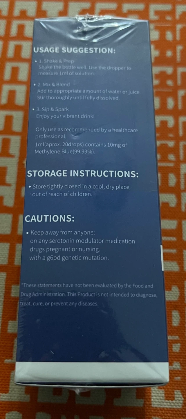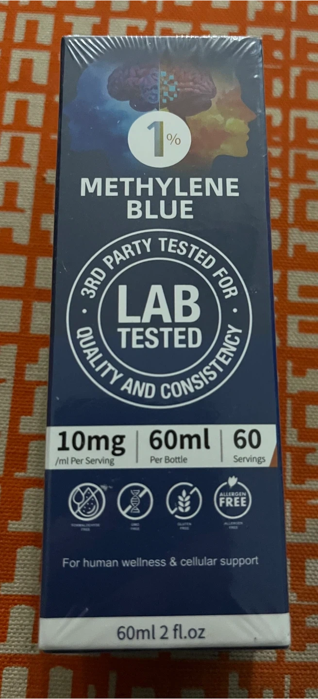 Methylene Blue Trihydrate solution. This 60ml bottle contains 60 servings, with each serving at 1ml delivering 10mg. It's lab tested for quality and consistency. MFG: August 30, 2025.