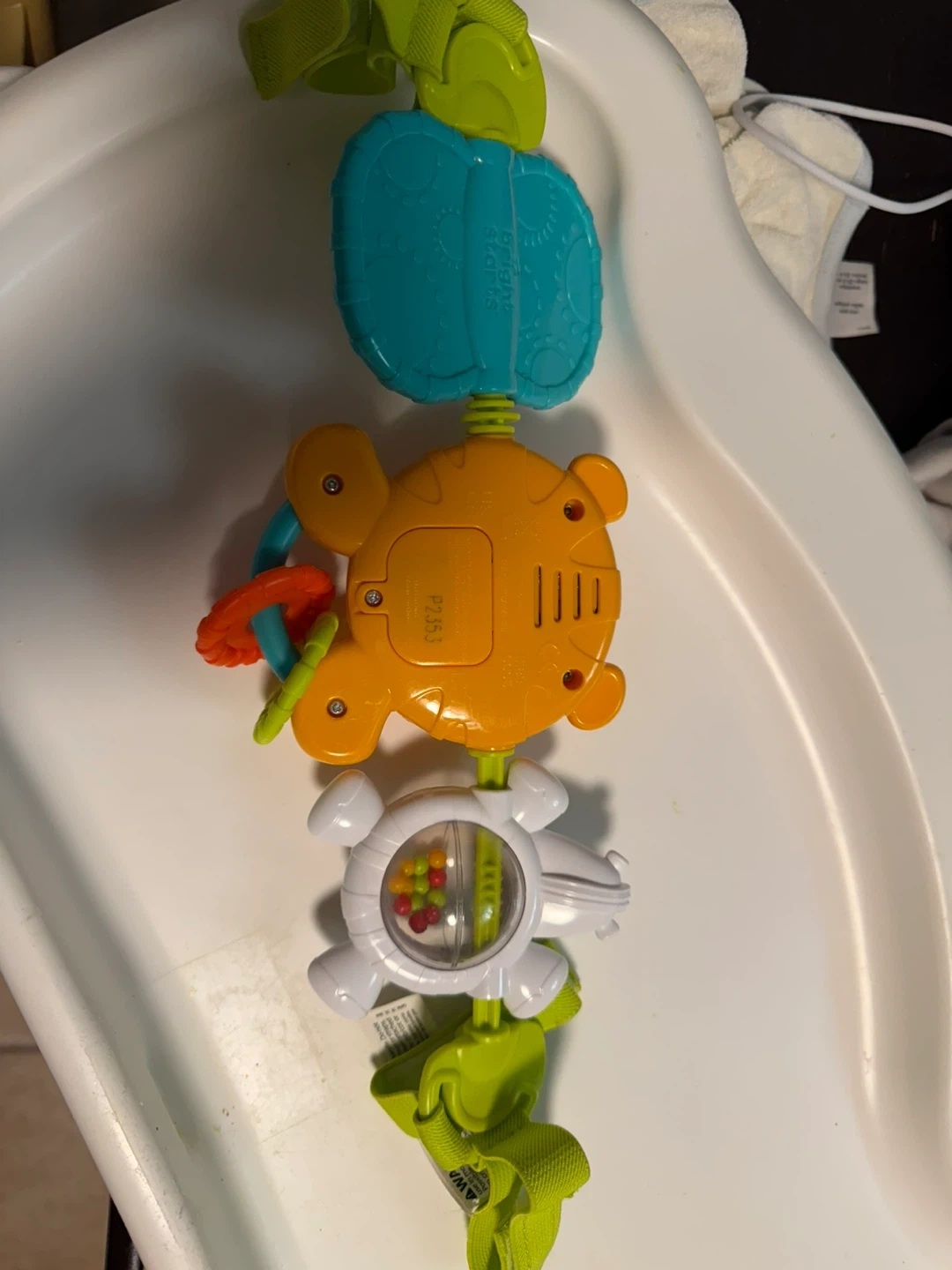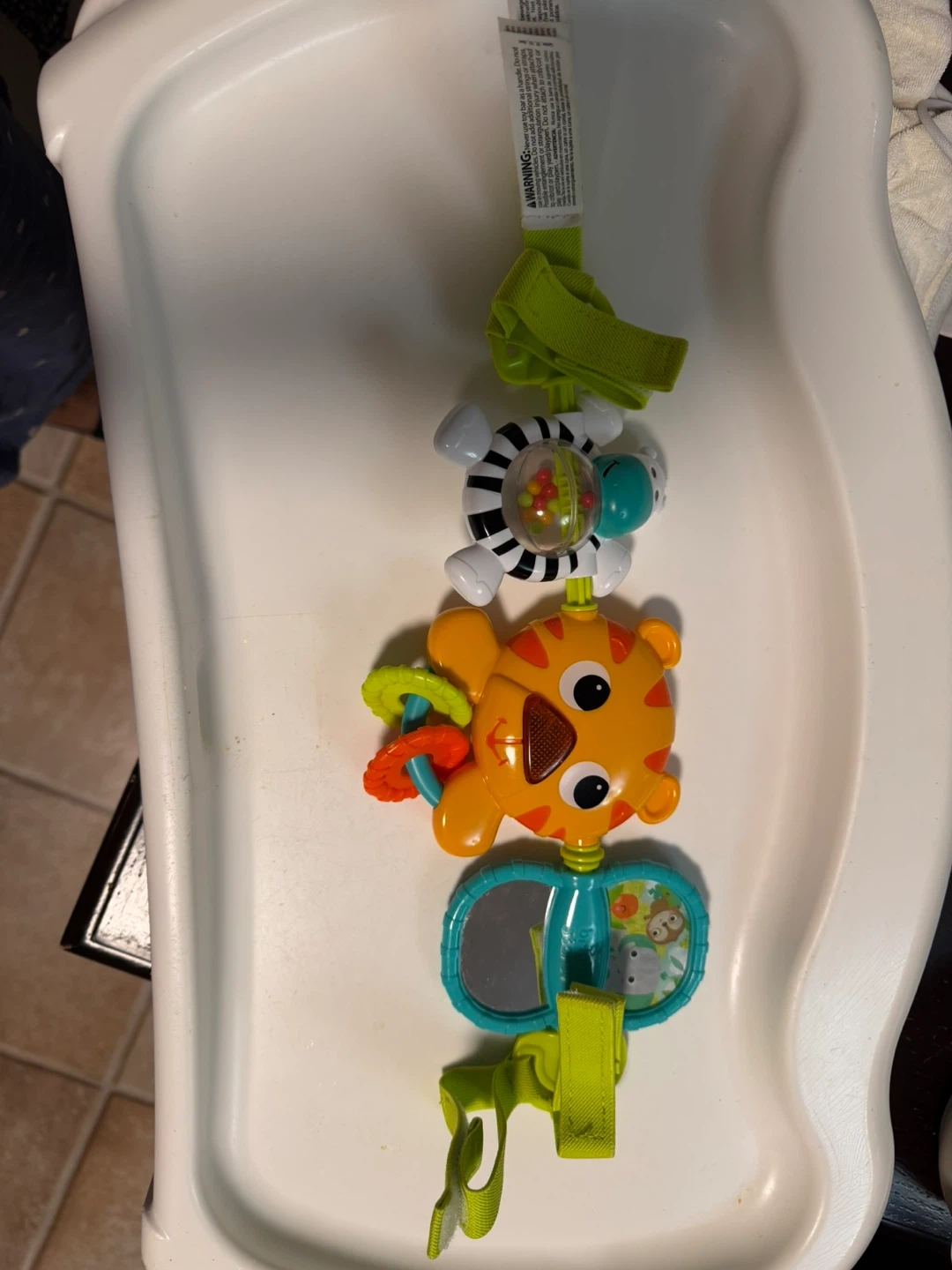 This Infantino Tag Along Pals activity toy features a tiger with a rattle and crinkle sounds. It also includes a zebra with beads and a mirror. Easy to attach to strollers or car seats. Great for engaging baby's senses!