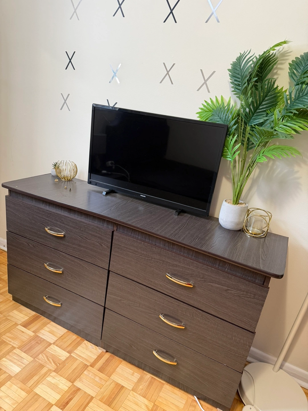 This is a six-drawer dresser and a 2 drawer side bed with a dark brown finish and beautiful gold handles. It's a great piece for bedroom storage. The drawers have gold-toned handles.