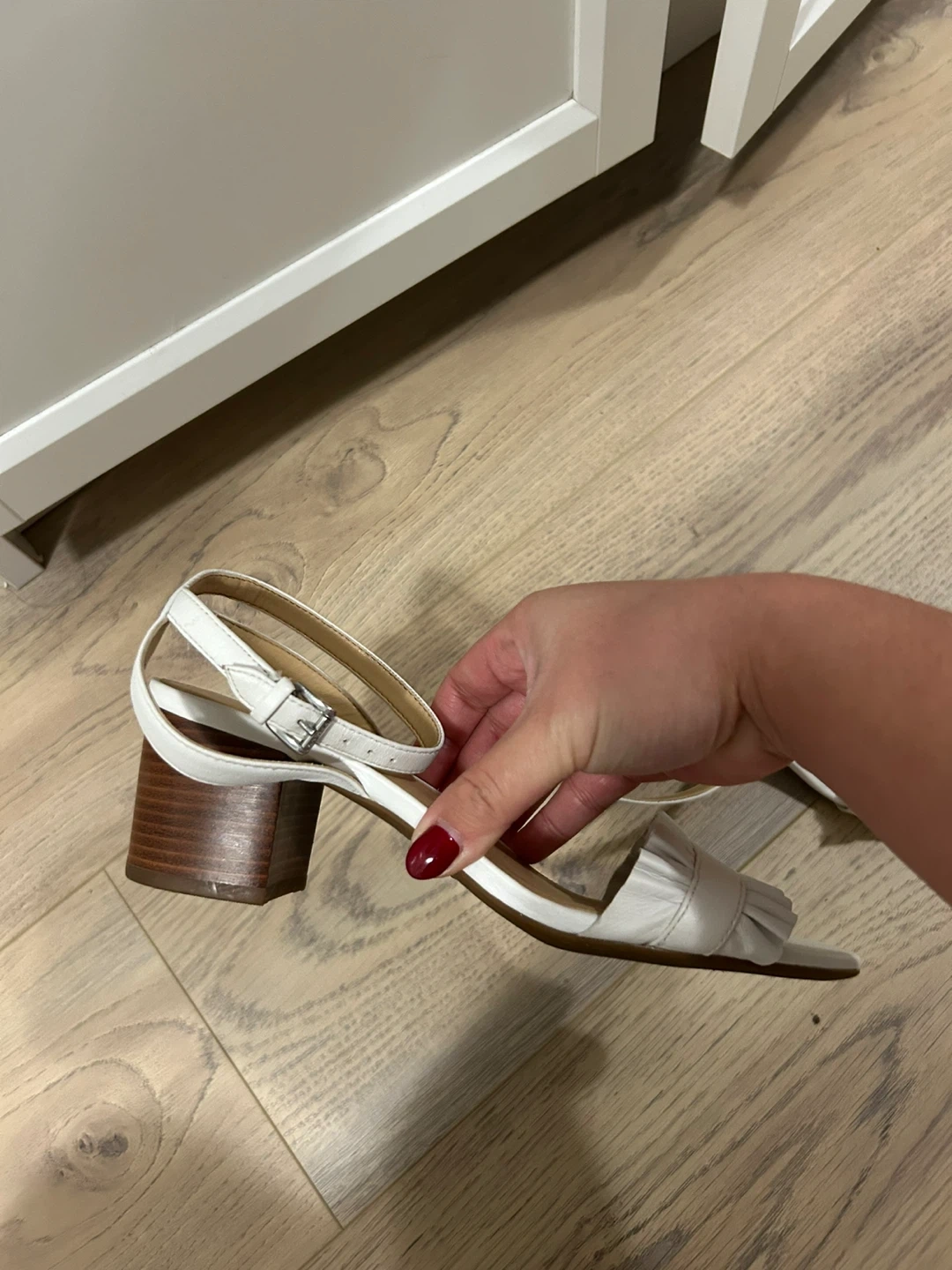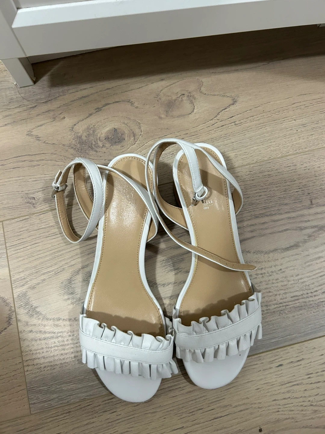 White leather sandals with a block heel and ankle strap. Features a decorative ruffled front detail. These stylish sandals are perfect for dressing up any summer outfit! Fit 6-6.5