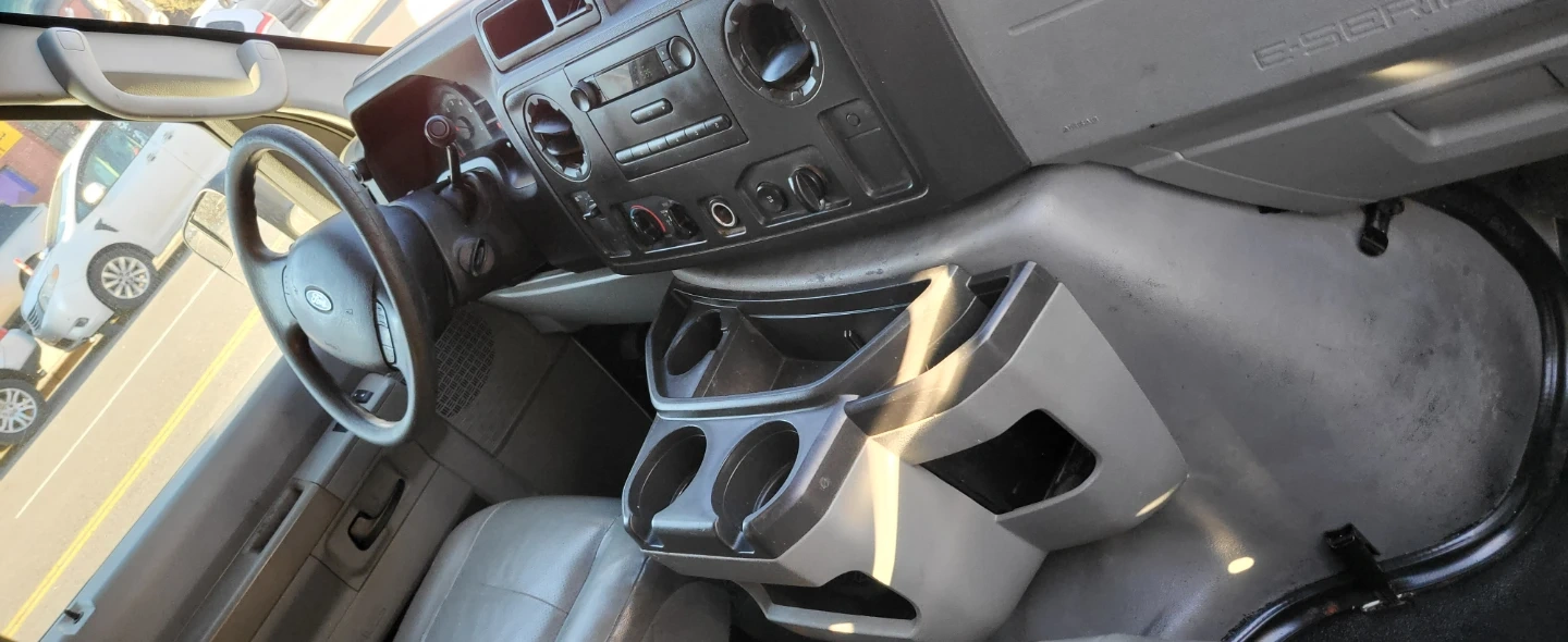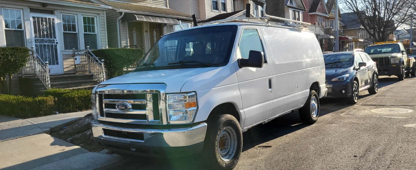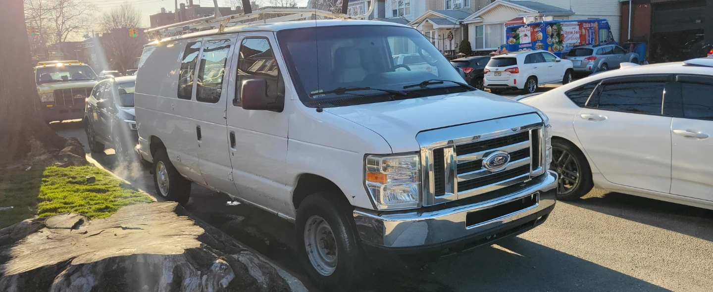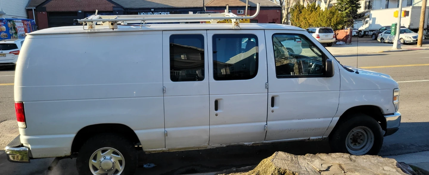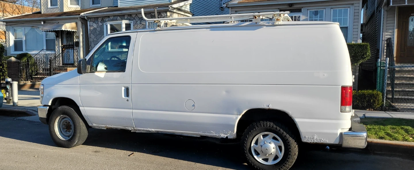 White Ford E-Series cargo van. Rack on top. Interior is gutted and ready for customization. This van's robust frame makes it suitable for a work vehicle.