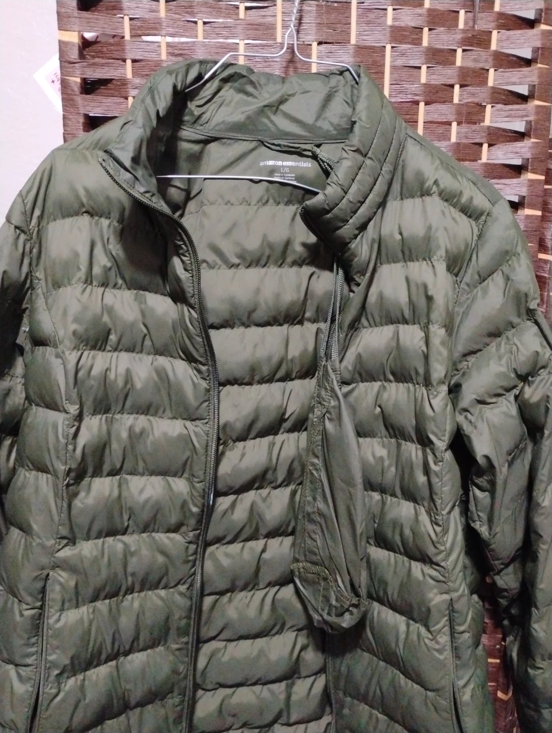 This is an Amazon Essentials puffer jacket in olive green. It's a lightweight and packable outerwear option. The jacket has a full zip front and zippered pockets. It's made of polyester.