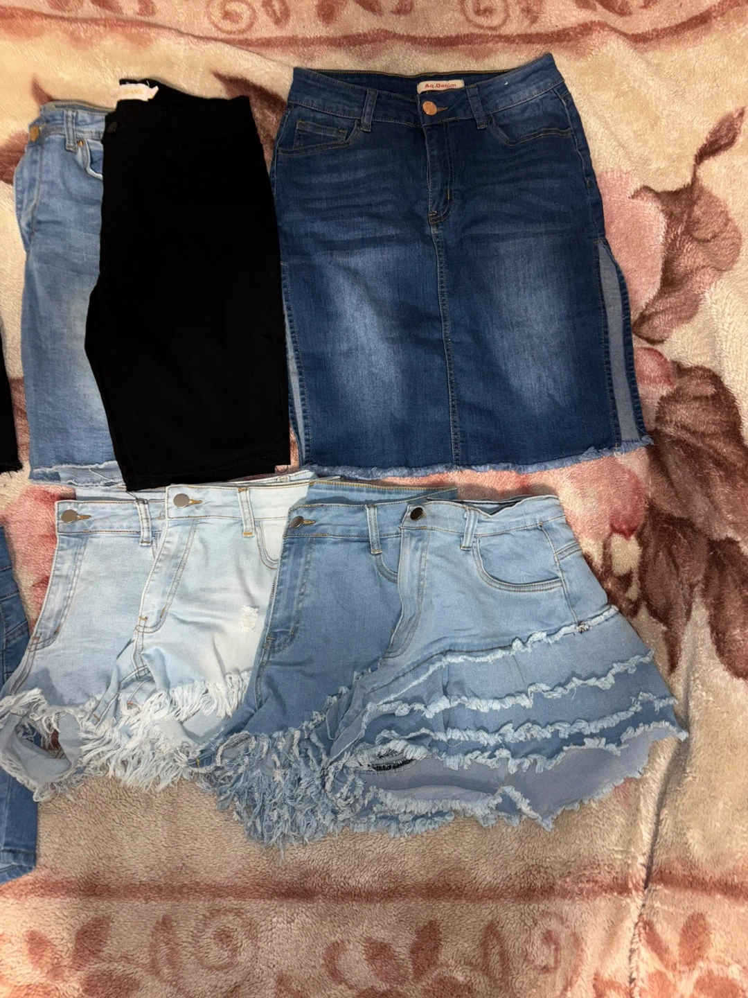 Bundle of various denim shorts, including distressed styles, fringe details, and a geometric print and one skirt with to slits on the side. Mostly light to medium wash denim. These shorts are perfect for casual wear during warmer weather! Sizes are 9, 11 and Large. If you’re only interested in one or a few please let me know.