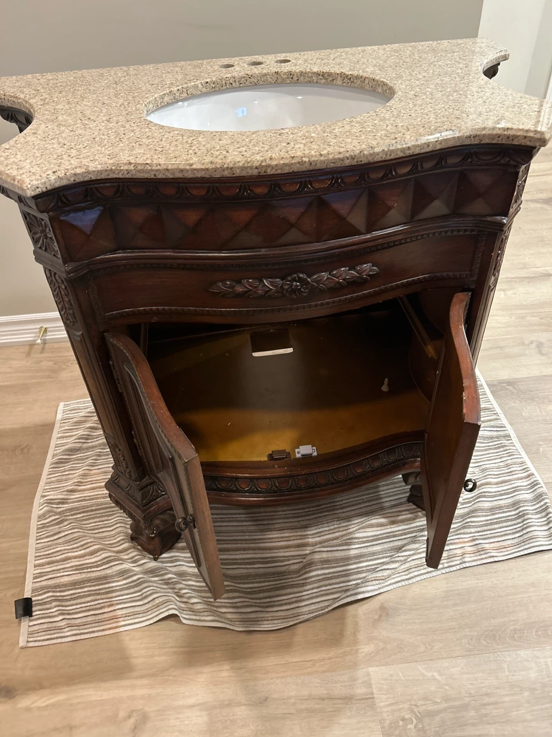 Beautifully crafted dark wood vanity featuring intricate carved details. It comes with a granite countertop and a white ceramic sink. The cabinet doors open to reveal storage space.