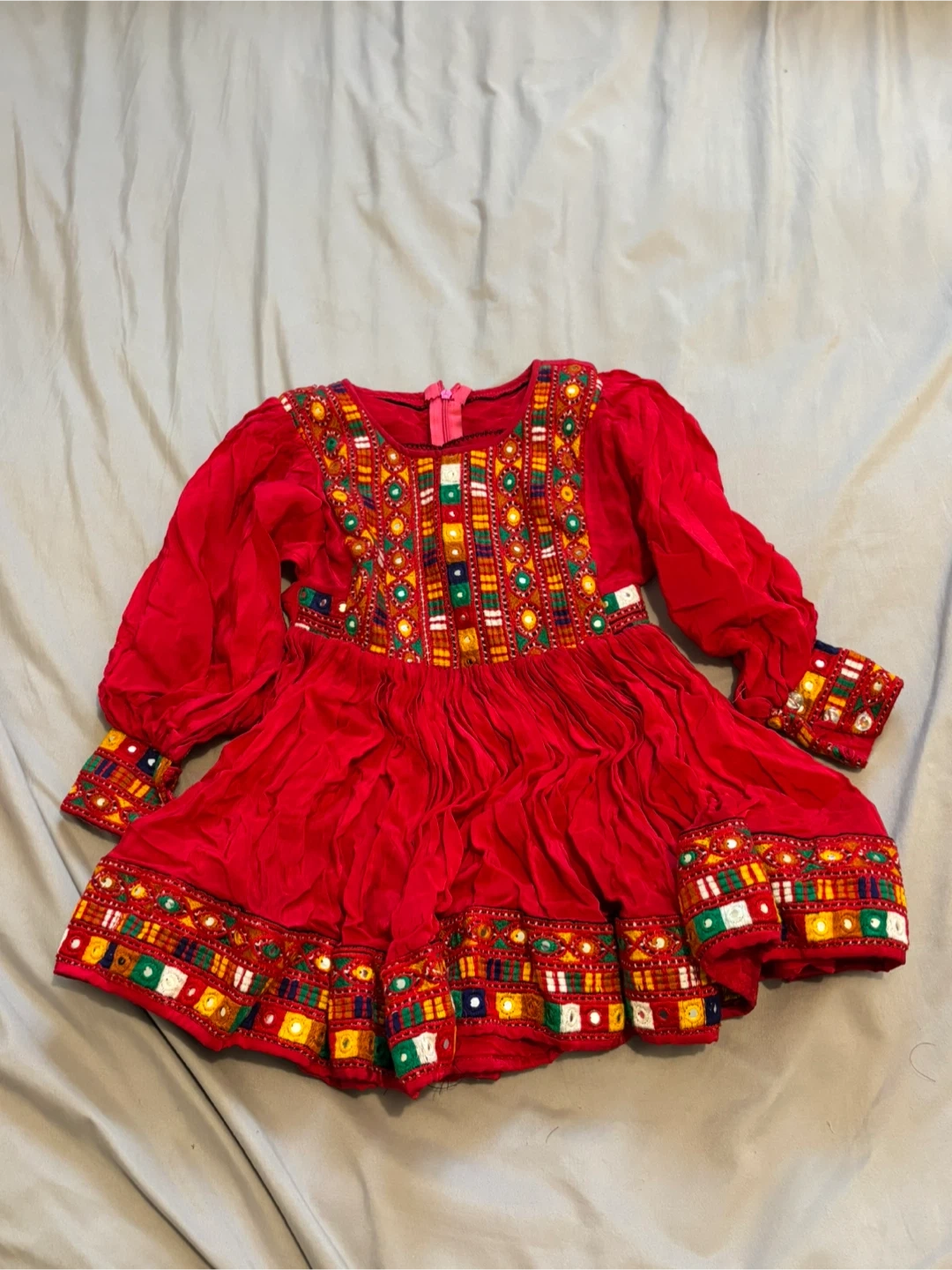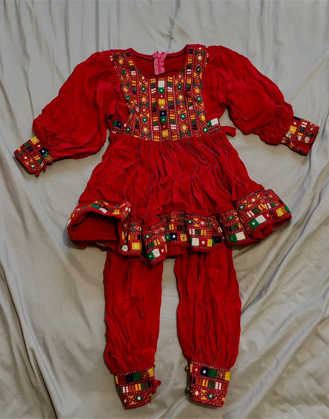 Beautiful red Afghan dress with matching pants and scarf for kids! The dress and pants feature intricate embroidery and embellishments. Perfect for cultural events or special occasions. The set includes a dress, pants, and a scarf.