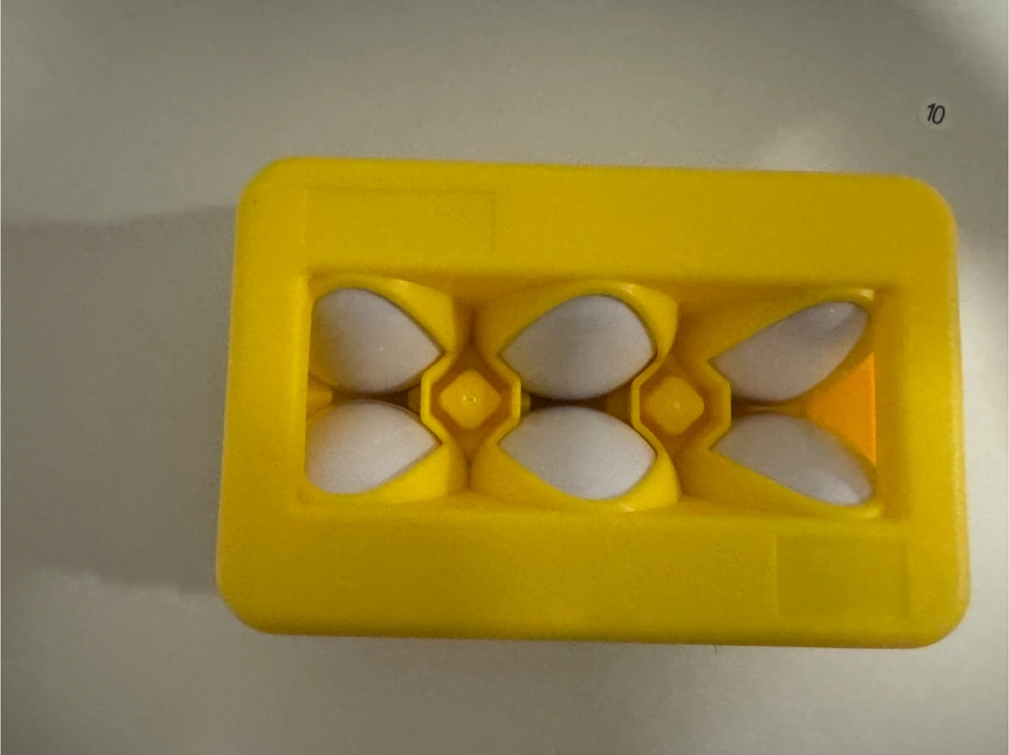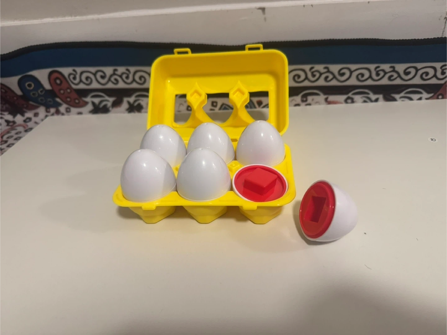 This toy egg carton comes with six white eggs. Some of the eggs have red bases inside, and one egg is shown disassembled. Made of plastic.