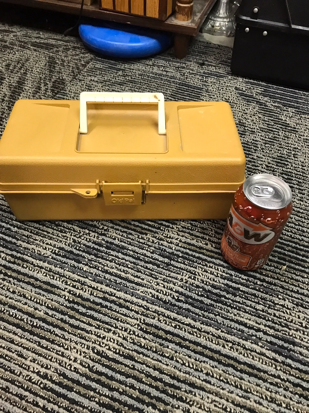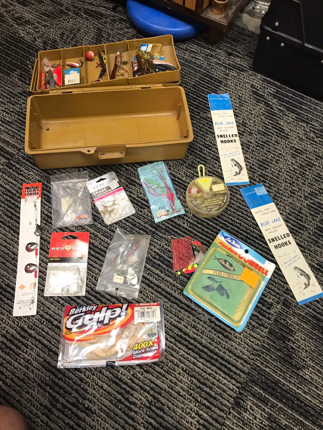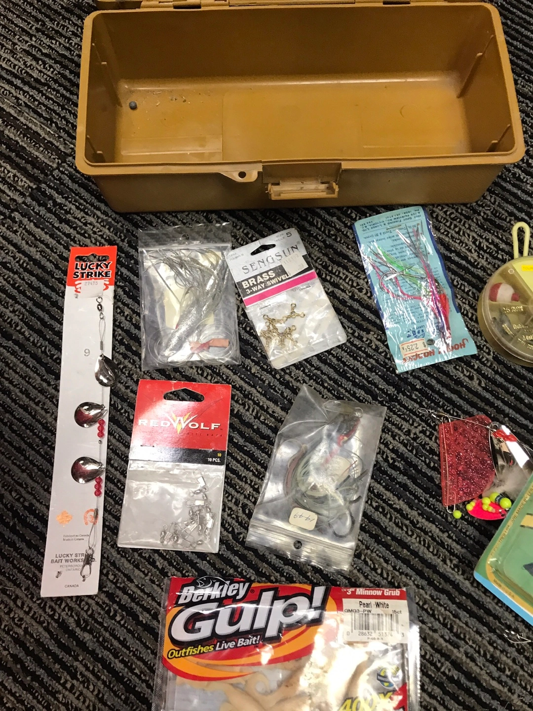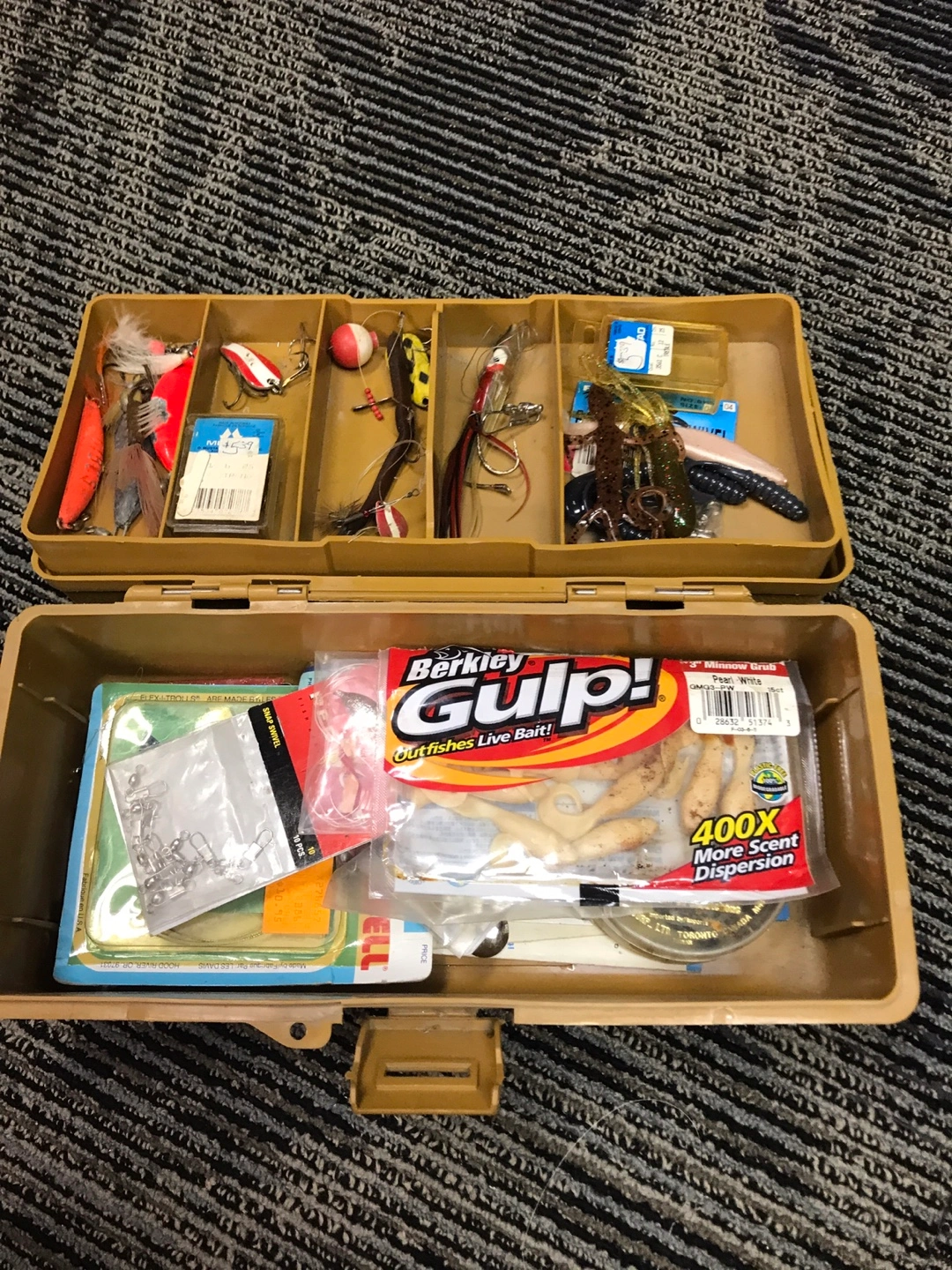 Brown plastic tackle box filled with assorted fishing lures, hooks, and soft baits. Includes a variety of brands like Berkley Gulp!. Great for organizing your fishing gear. $40.00