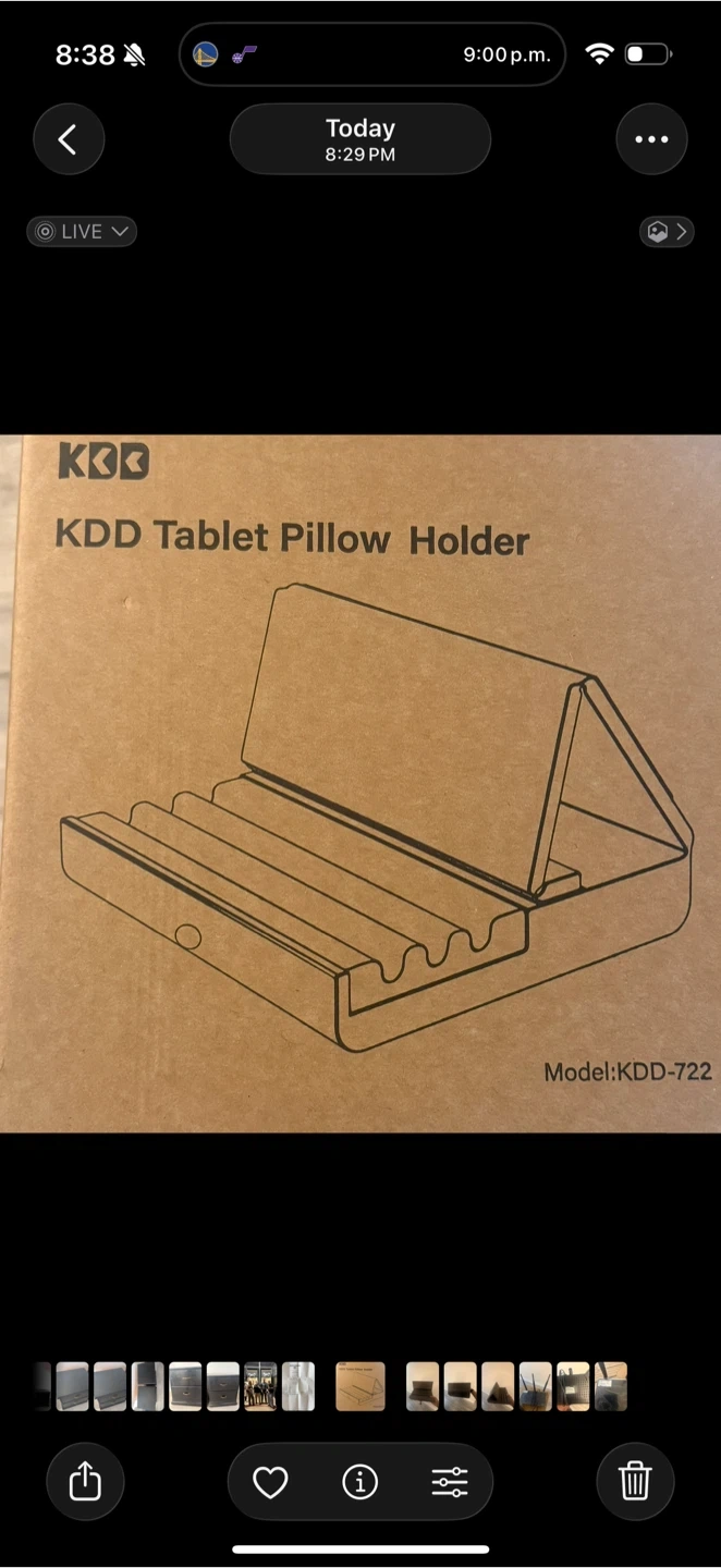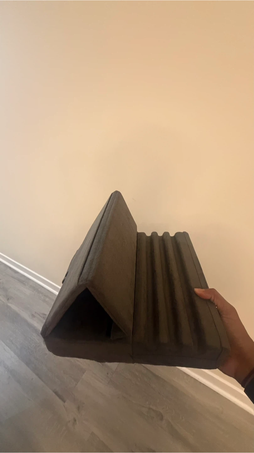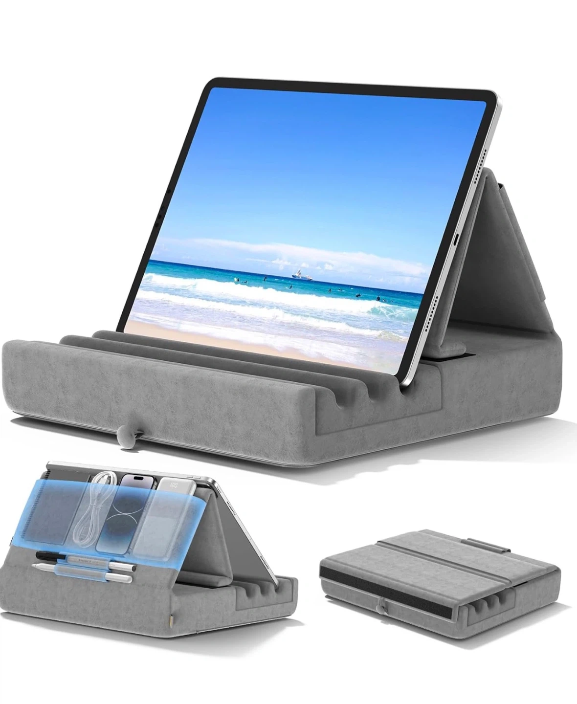 KDD tablet pillow holder for iPads and other tablets. It's made of soft, durable fabric and includes storage pockets for accessories. This pillow holder is perfect for use in bed or on the couch!