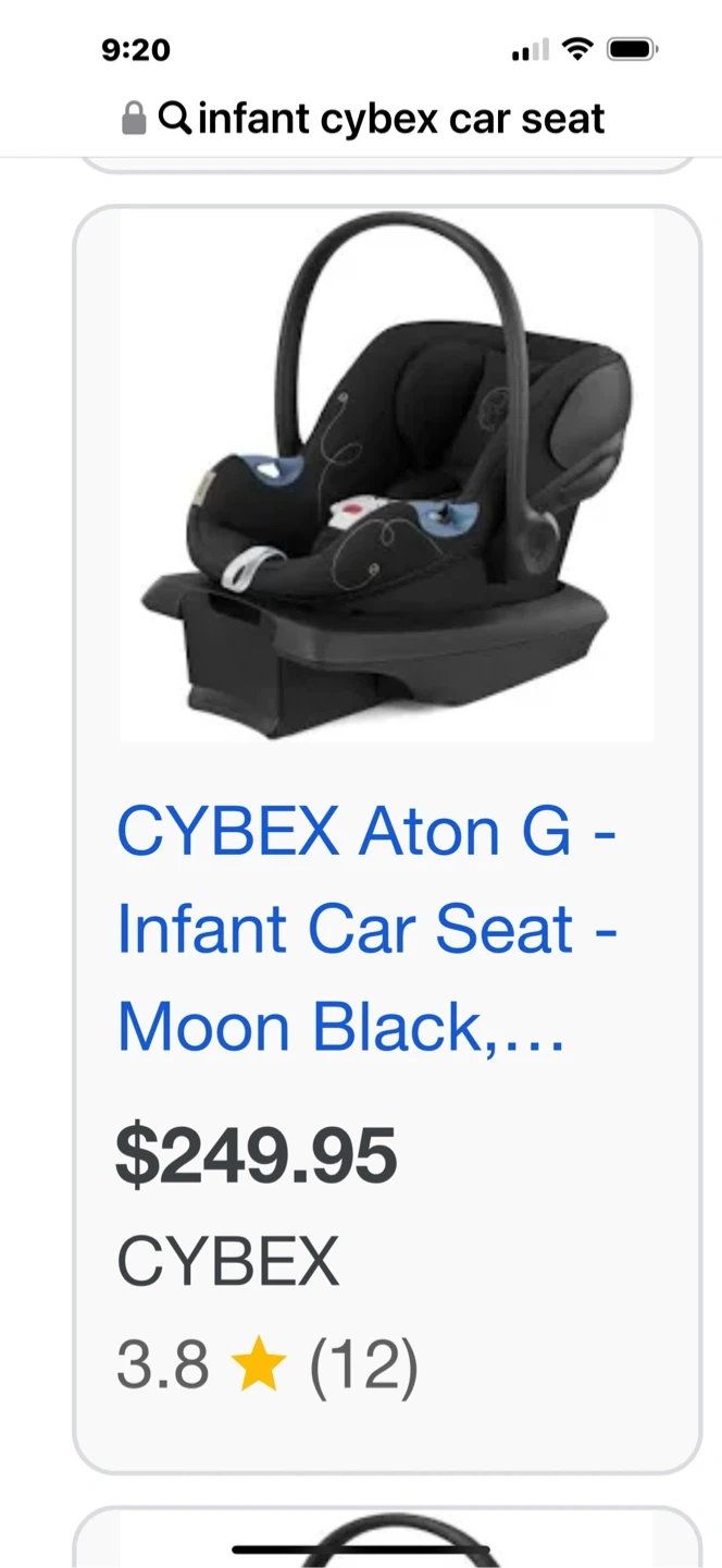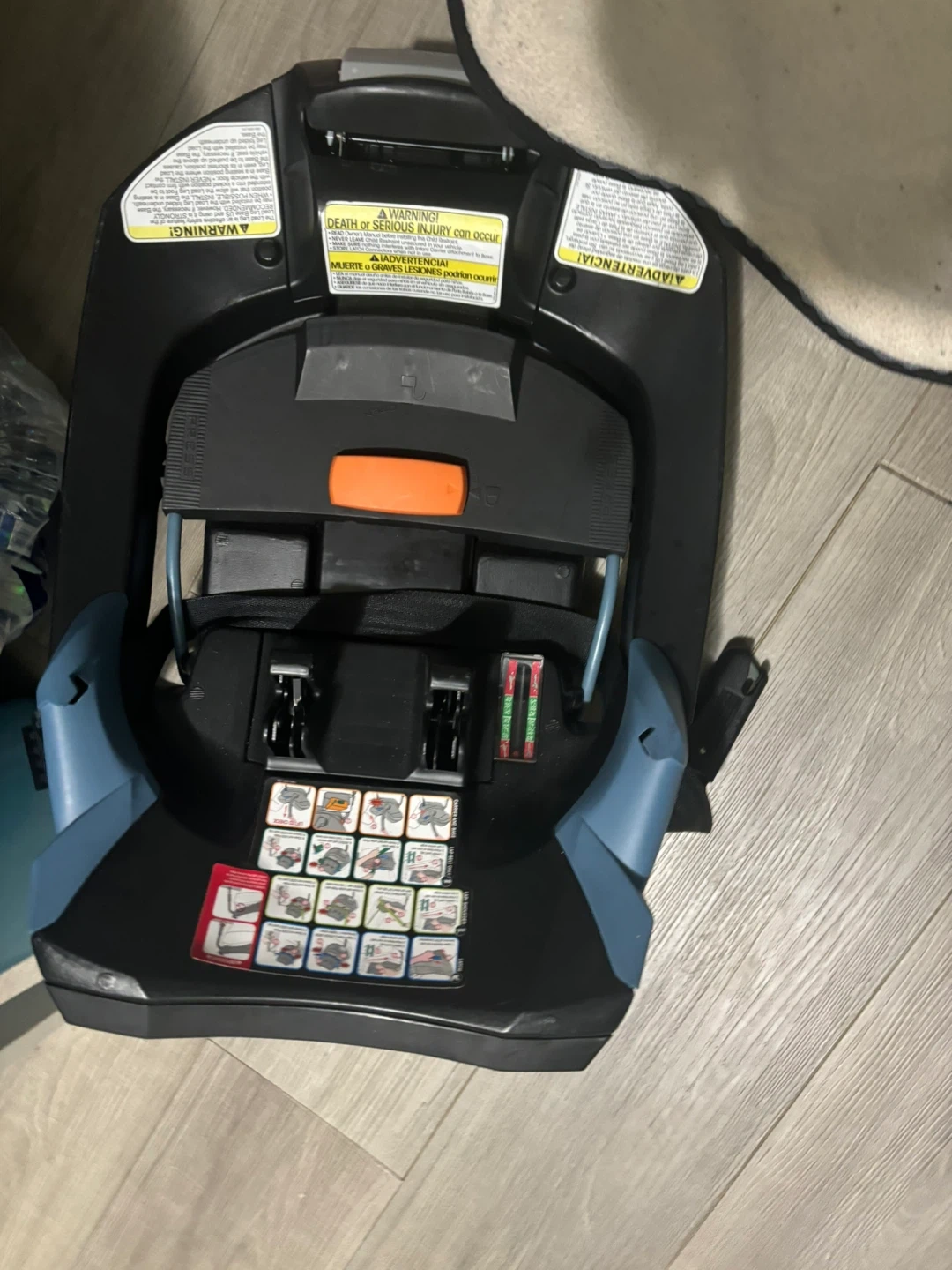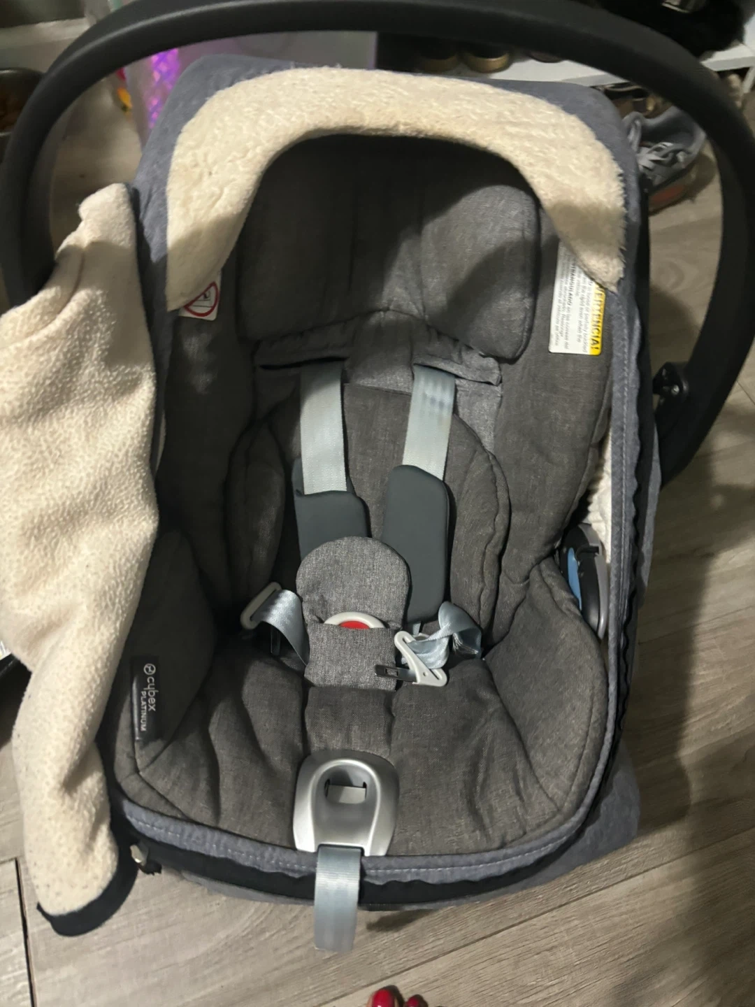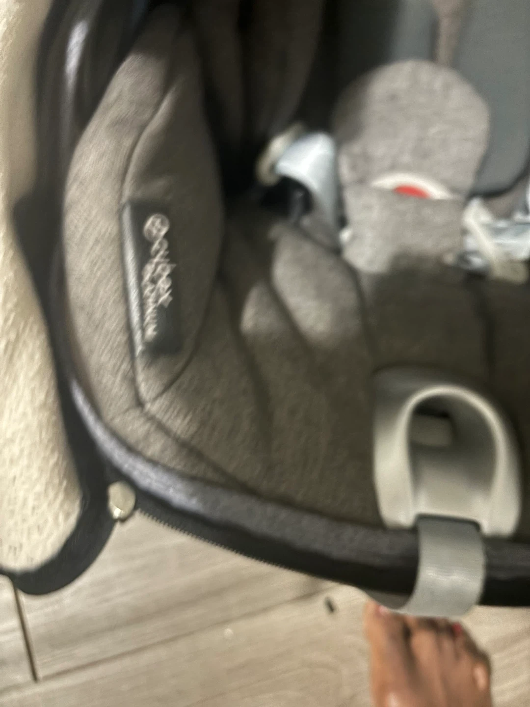 This is a Cybex infant car seat with its accompanying base. It's a gray and beige color. Includes infant padding for comfort.