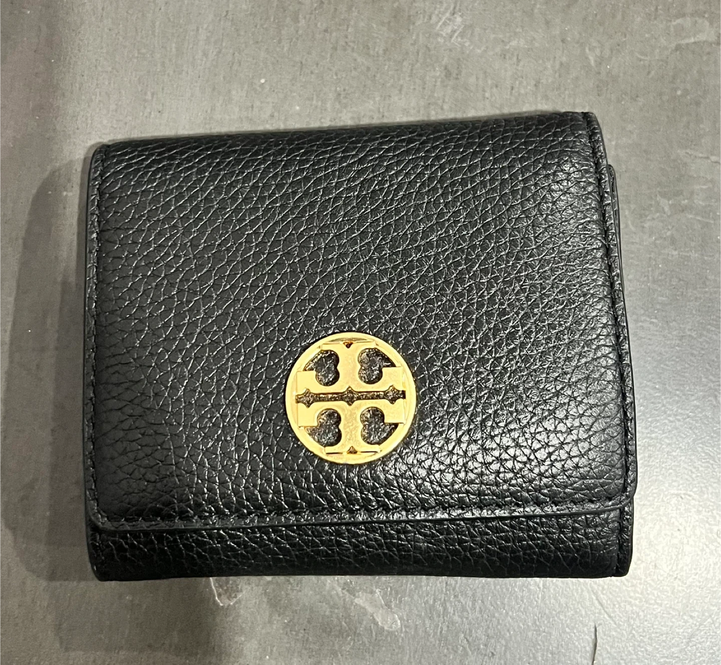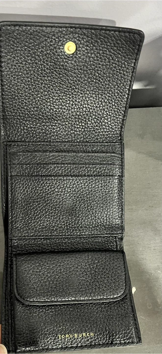 Black pebbled leather trifold wallet from Tory Burch. It features multiple card slots and a coin pocket. This compact wallet is perfect for everyday use!