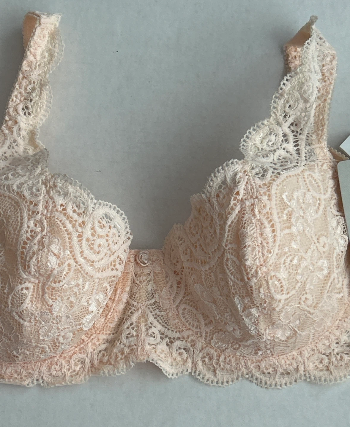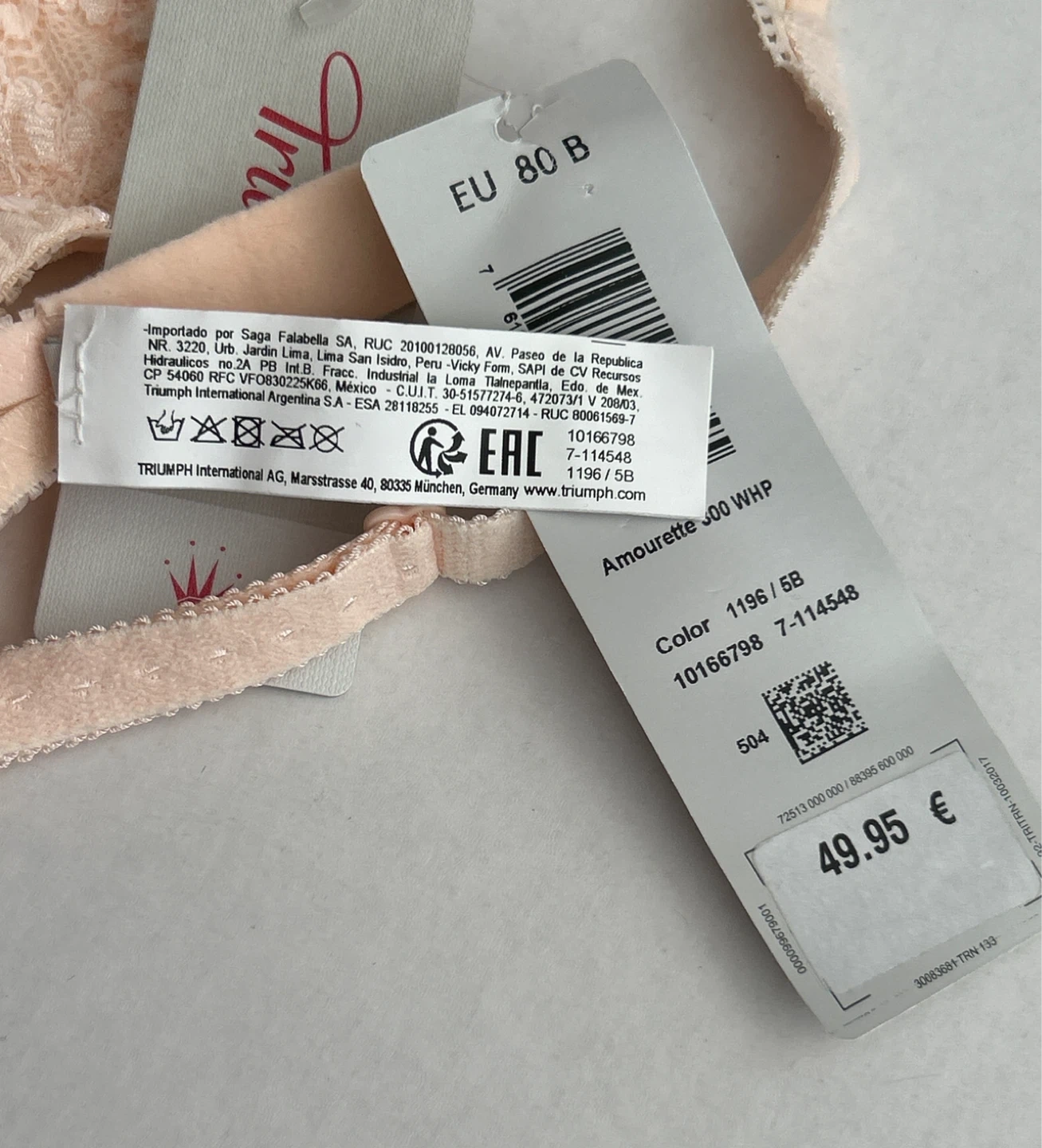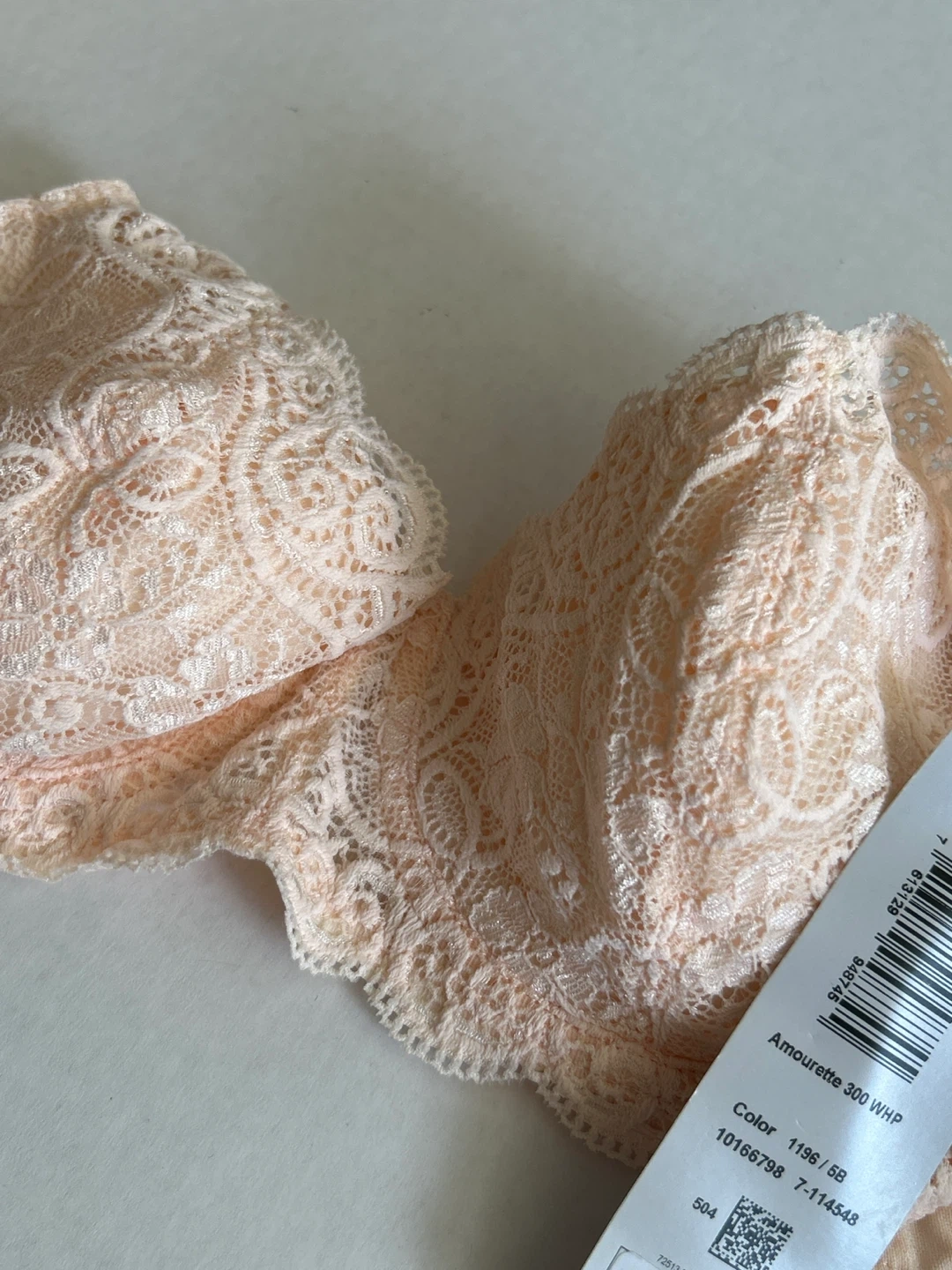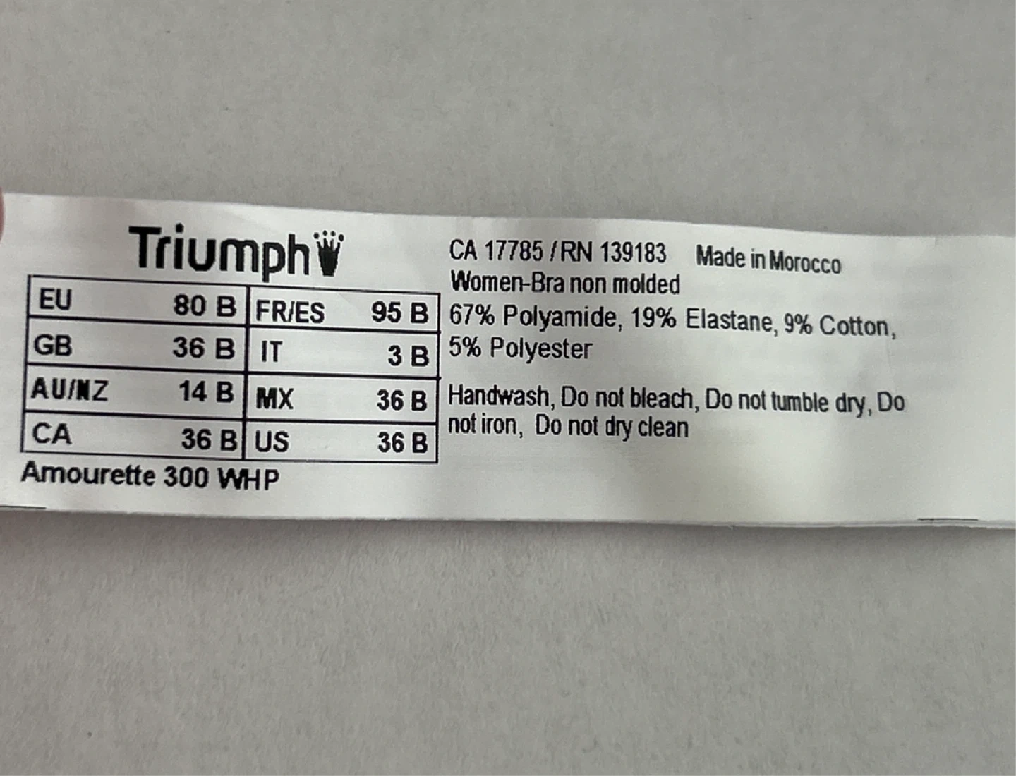 This is a brand new bra with tags - Triumph Amourette 300 WHP non-molded bra. It's made with 67% Polyamide, 19% Elastane, 9% Cotton, and 5% Polyester. Handwash only.