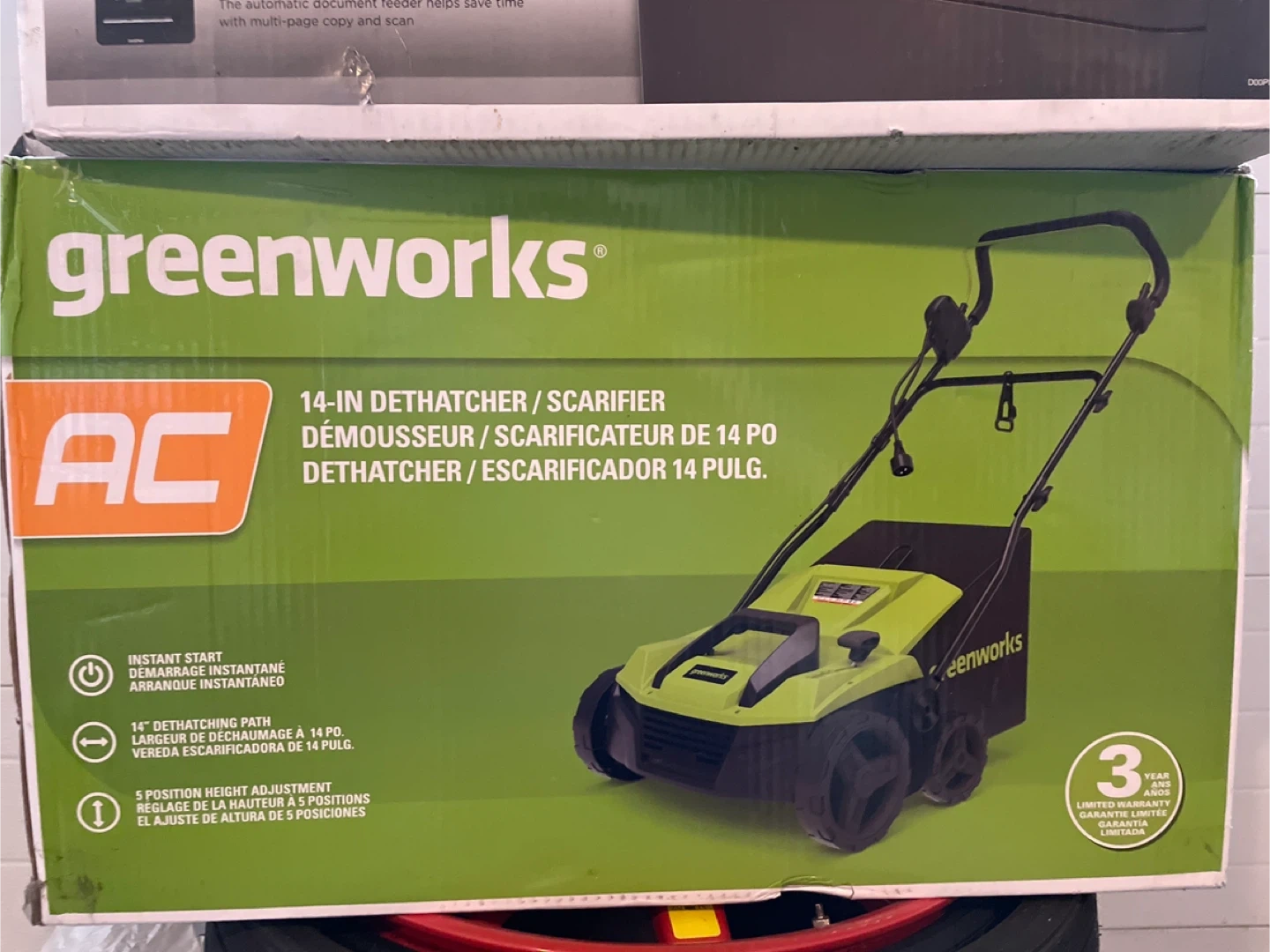 This is a Greenworks 14-inch AC Dethatcher/Scarifier. It offers instant start, a 14-inch dethatching path, and 5 positions for height adjustment. This tool is for lawn maintenance.