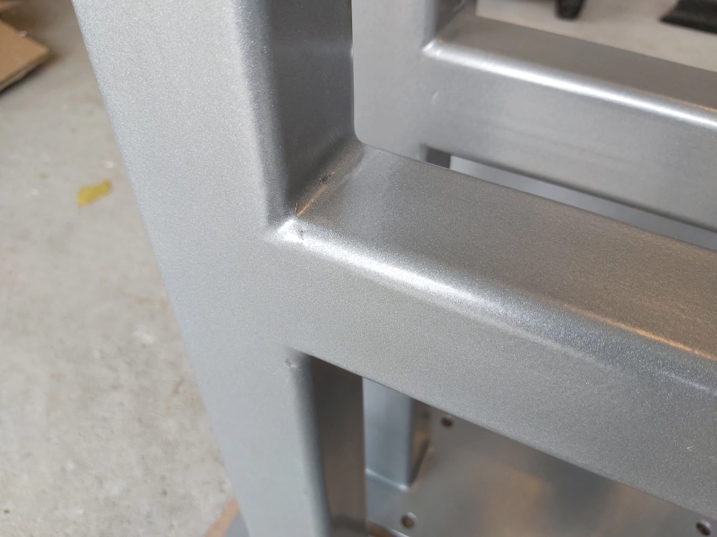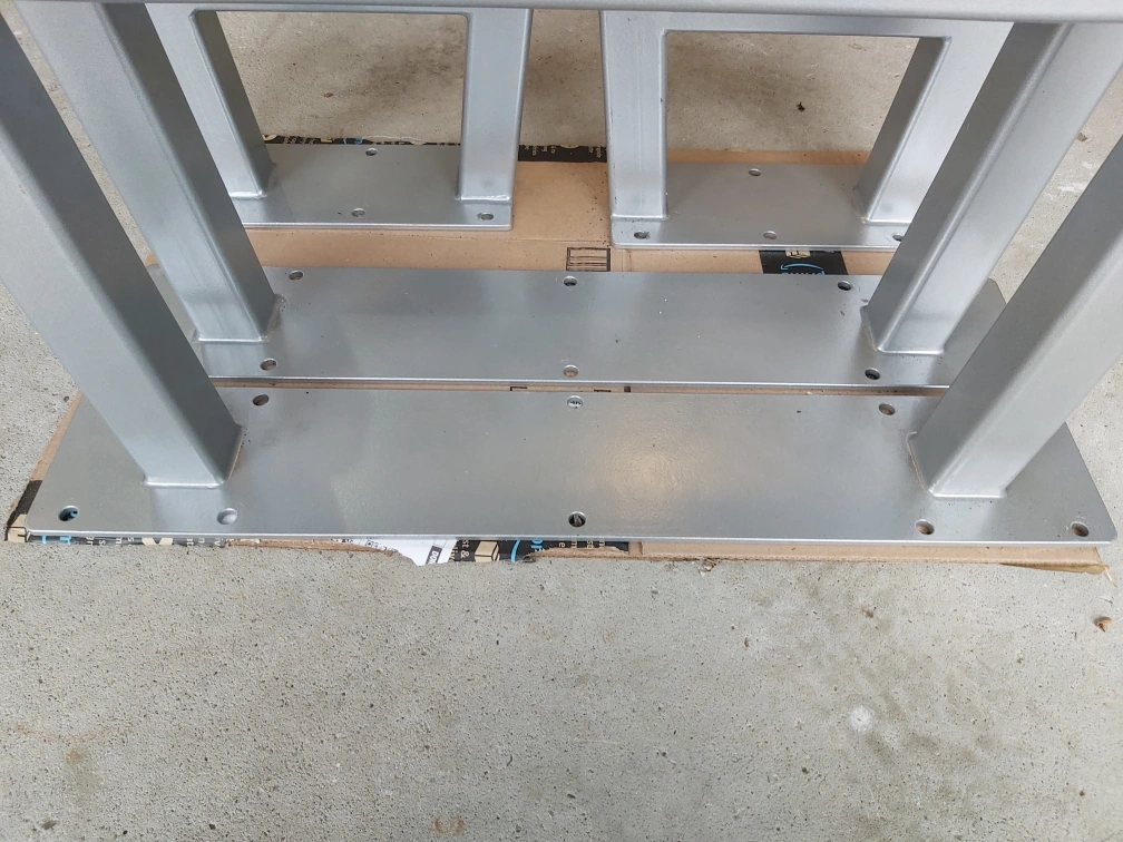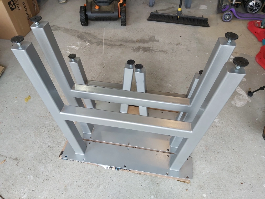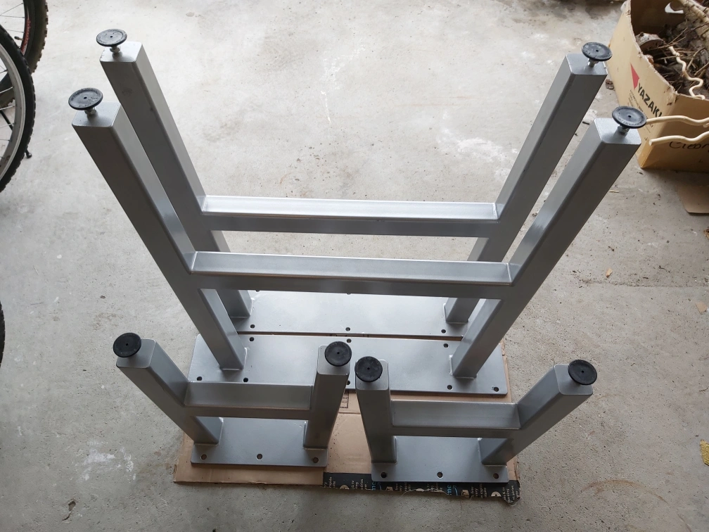 Set of 2 table legs and 2 bench legs for live edge tables and benches. Metal construction, silver painted finish. Square legs with a flat base. Feet have rubber pads.